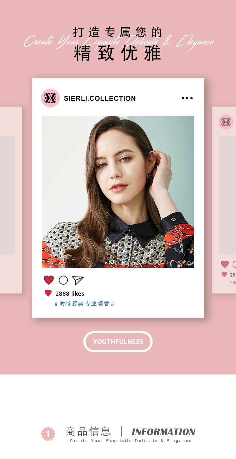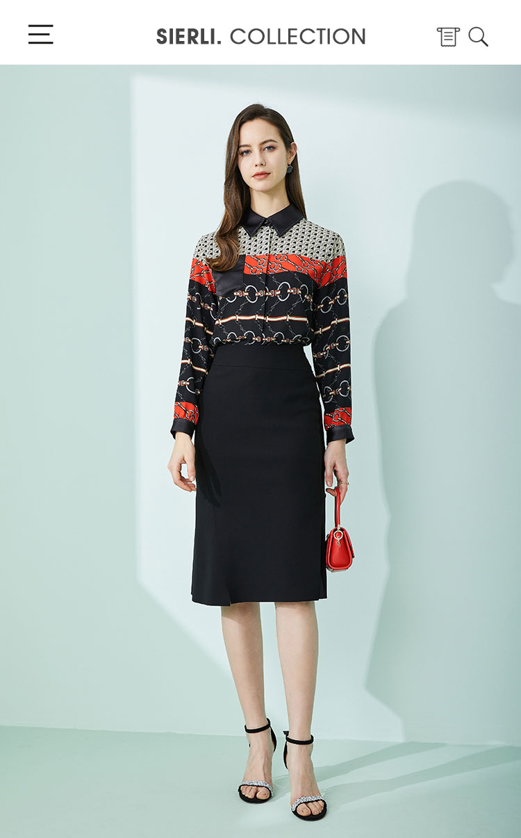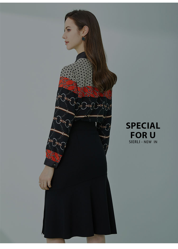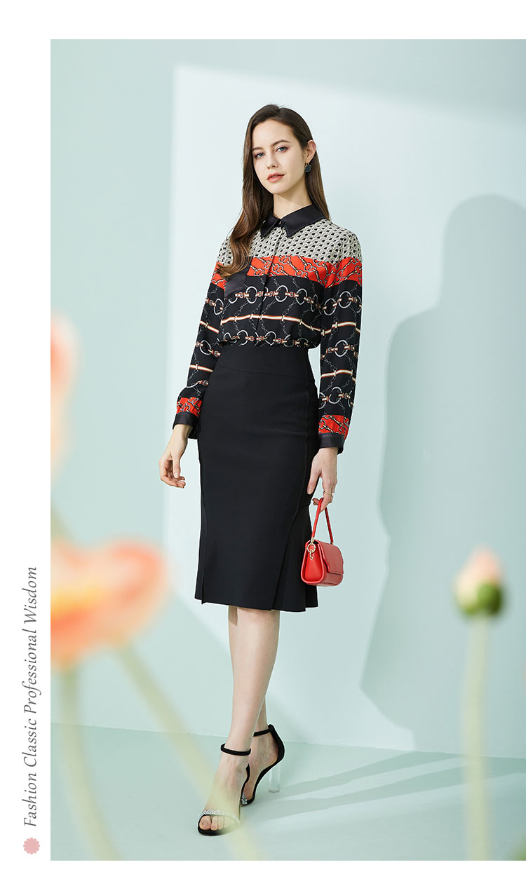 商品名称:春季复古链条印花撞色领子和口袋烫钻长袖女式衬衫 210591