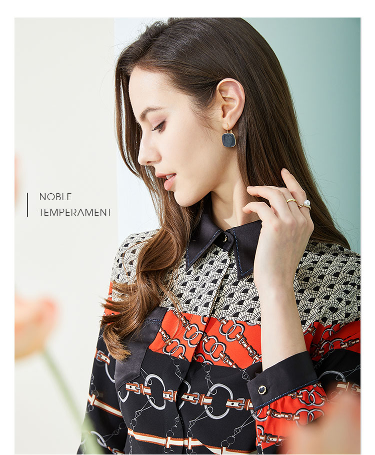 春季复古链条印花撞色领子和口袋烫钻长袖女式衬衫 210591