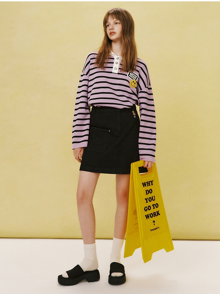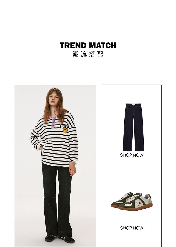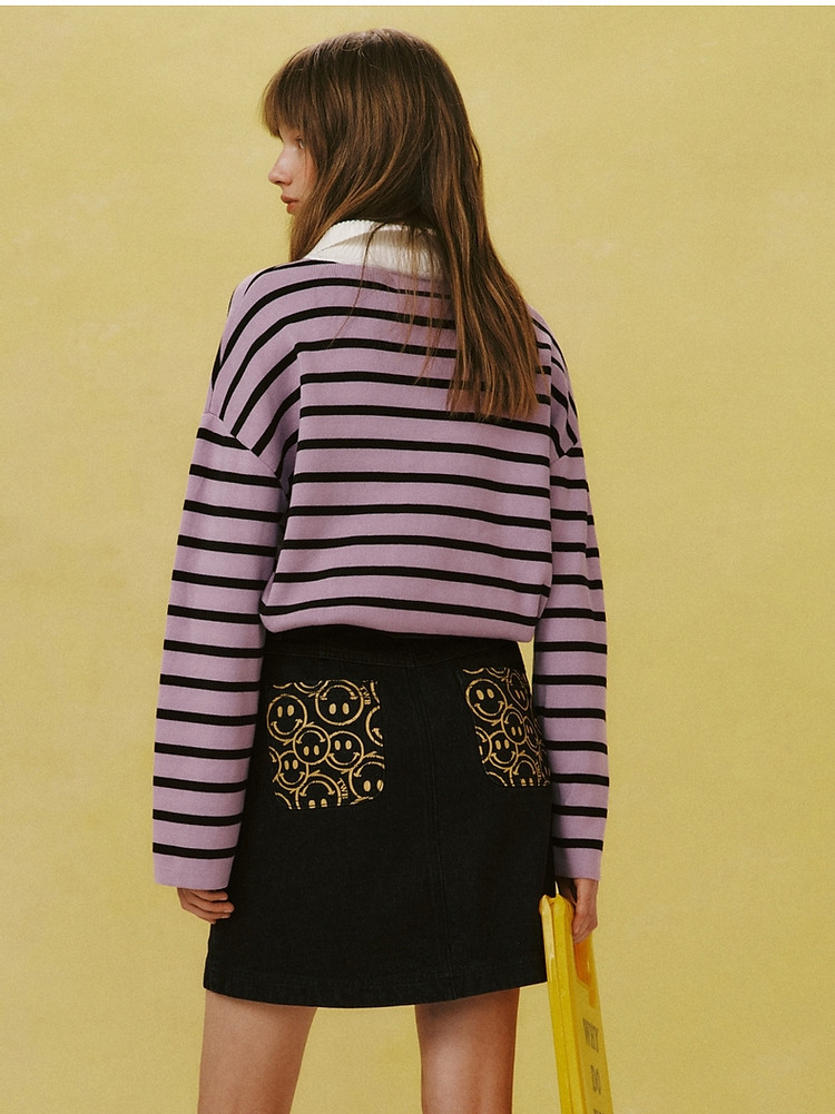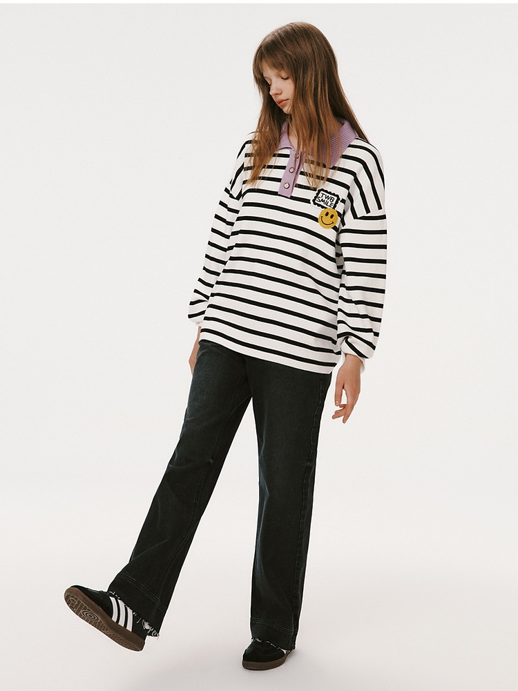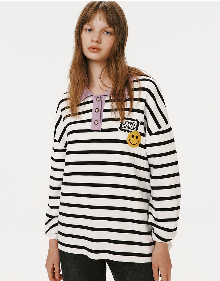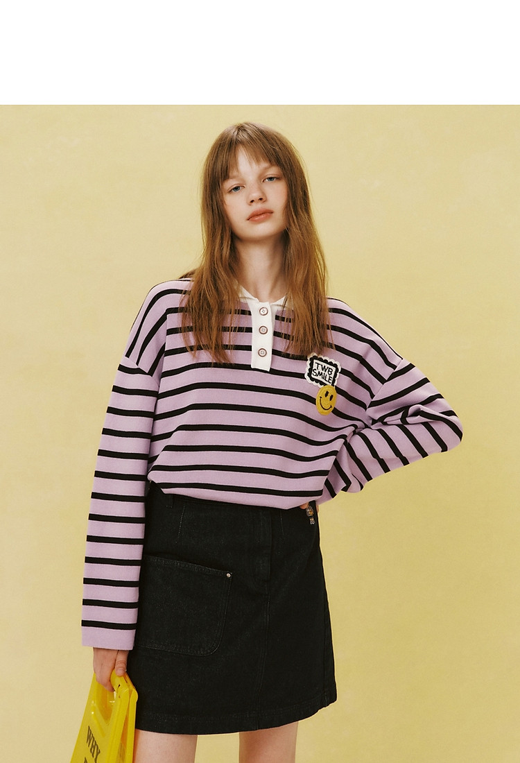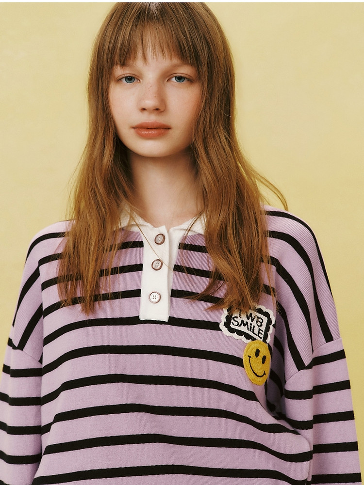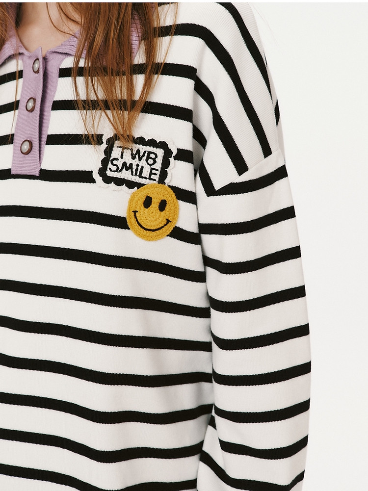 小熊女装宽松条纹长袖POLO领毛衣手工钩花FG时尚女上衣 939649