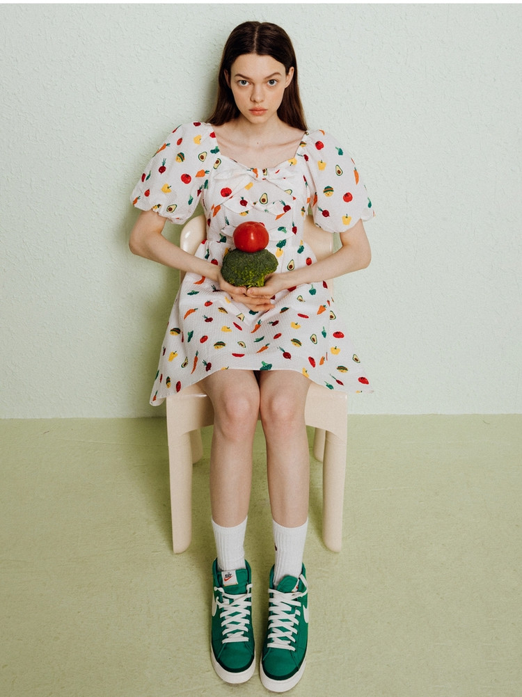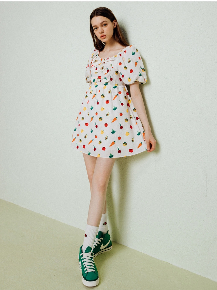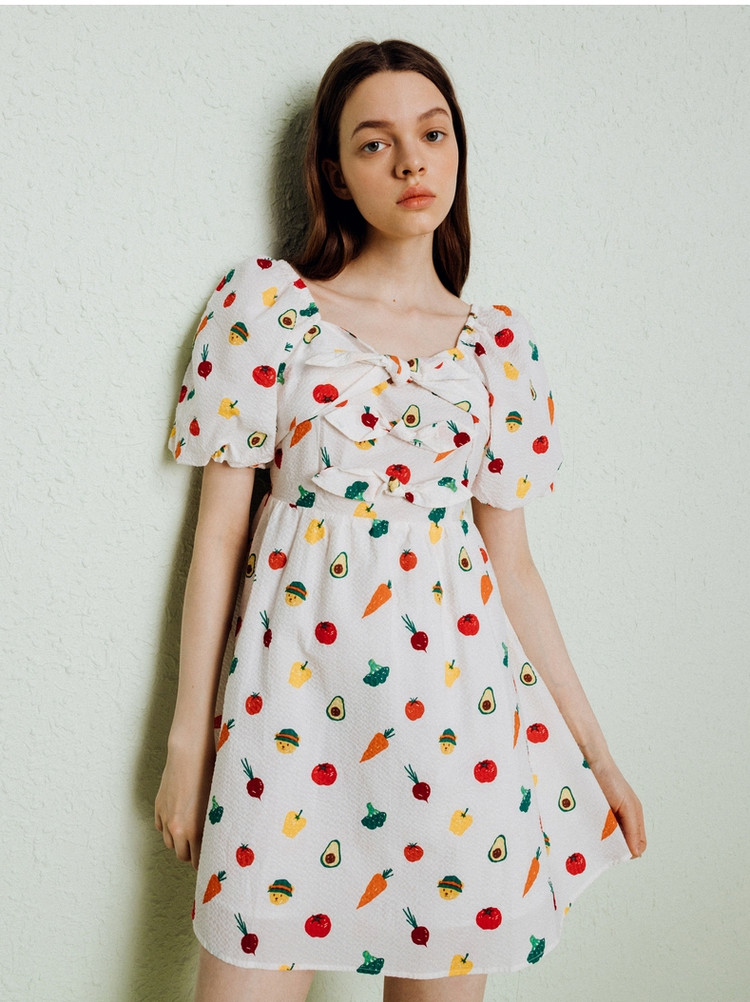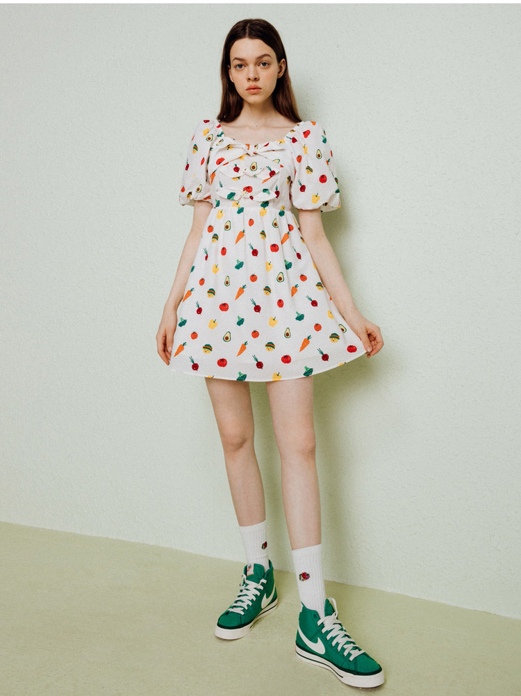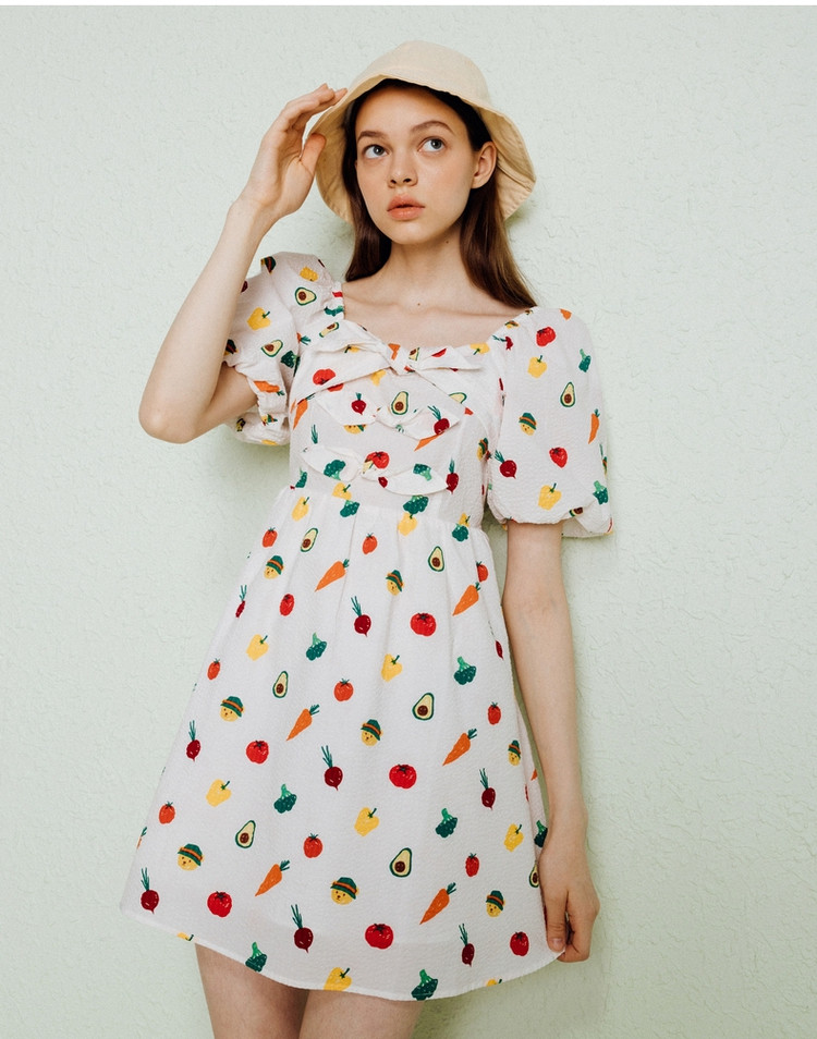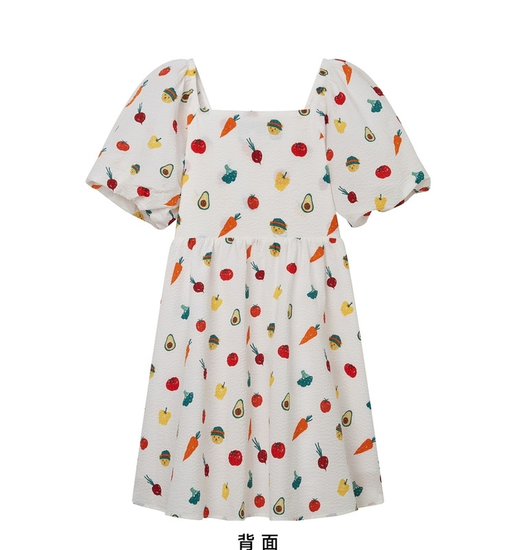 小熊泡泡袖连衣裙女法式方领气质公主裙可爱女夏 011329