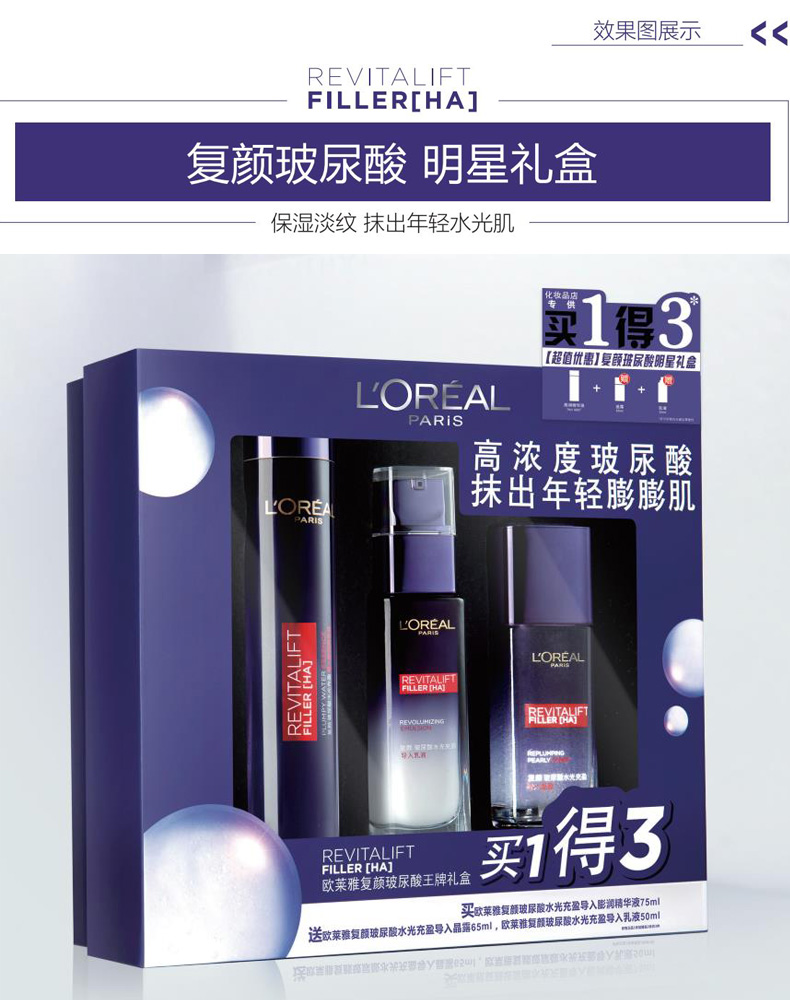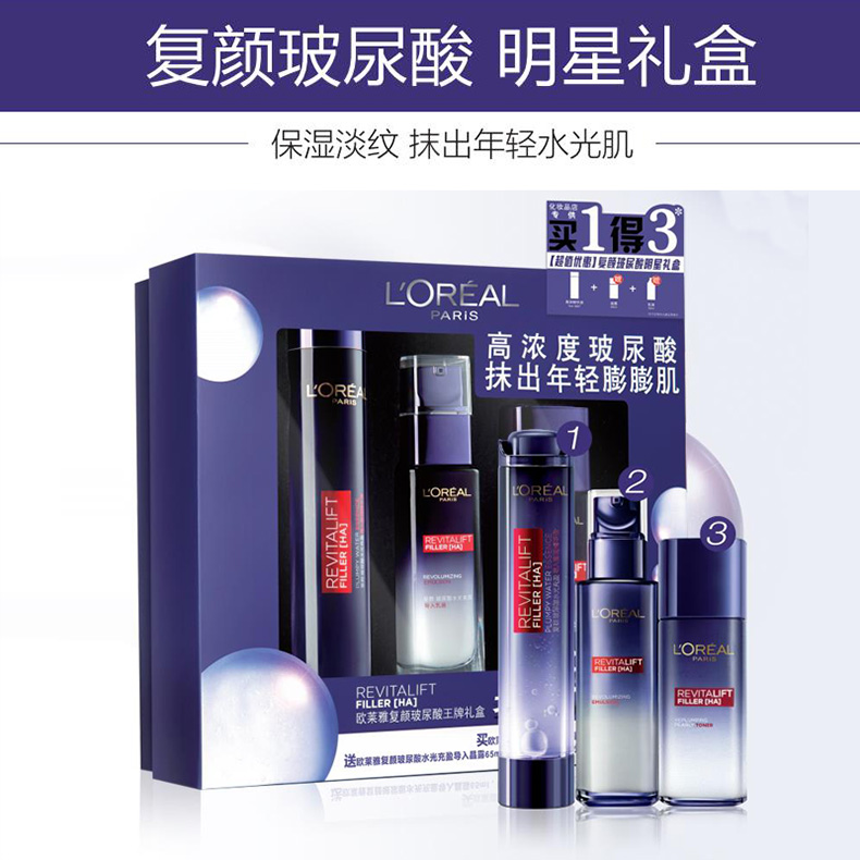 商品名称:L'oreal/欧莱雅 复颜玻尿酸水光盈补水滋润3件套 膨润精华液75ml+导入晶露65ml+乳液50ml