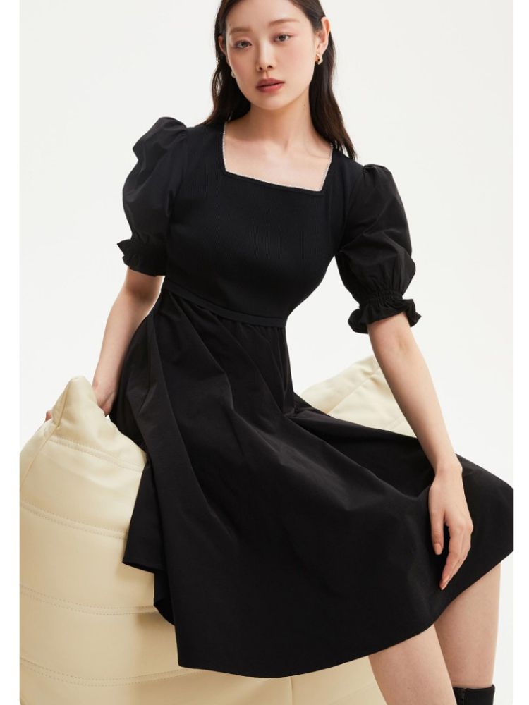专柜同款方领泡泡袖优雅气质通勤针织连衣裙 473745