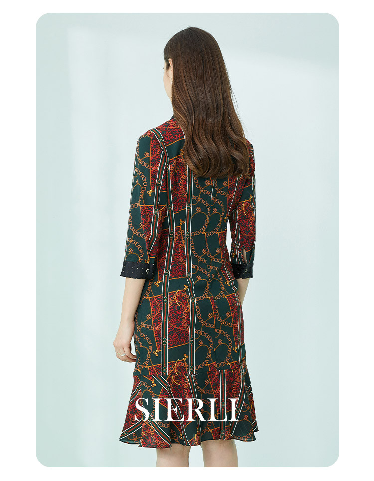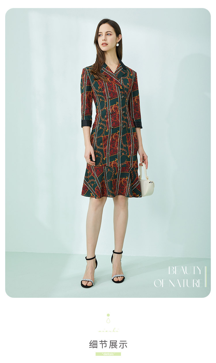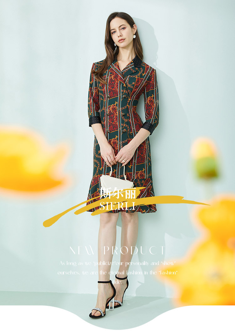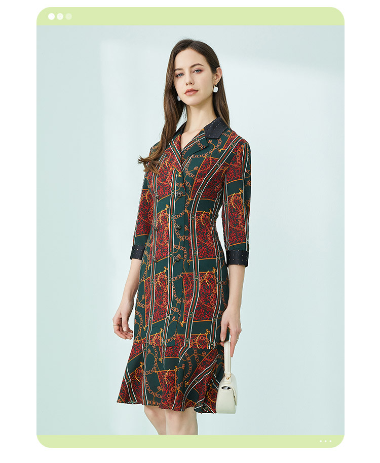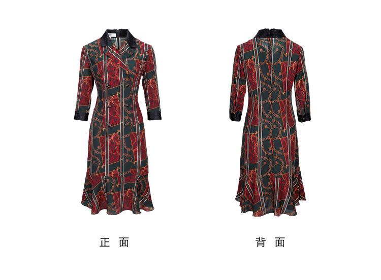 商品名称:商场同款春季复古巴洛克金链油画印花撞色翻连衣裙 019167