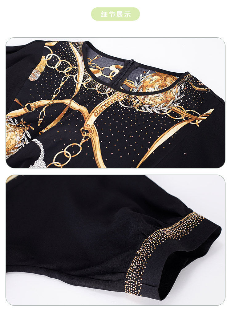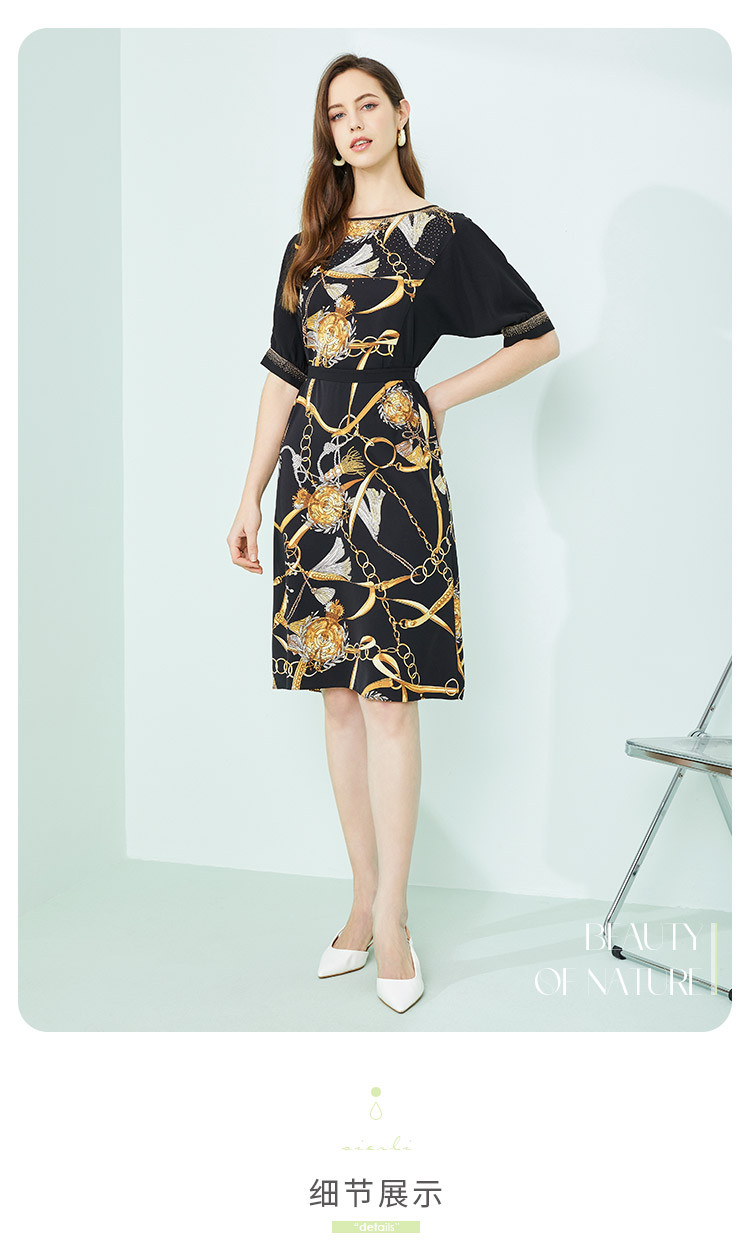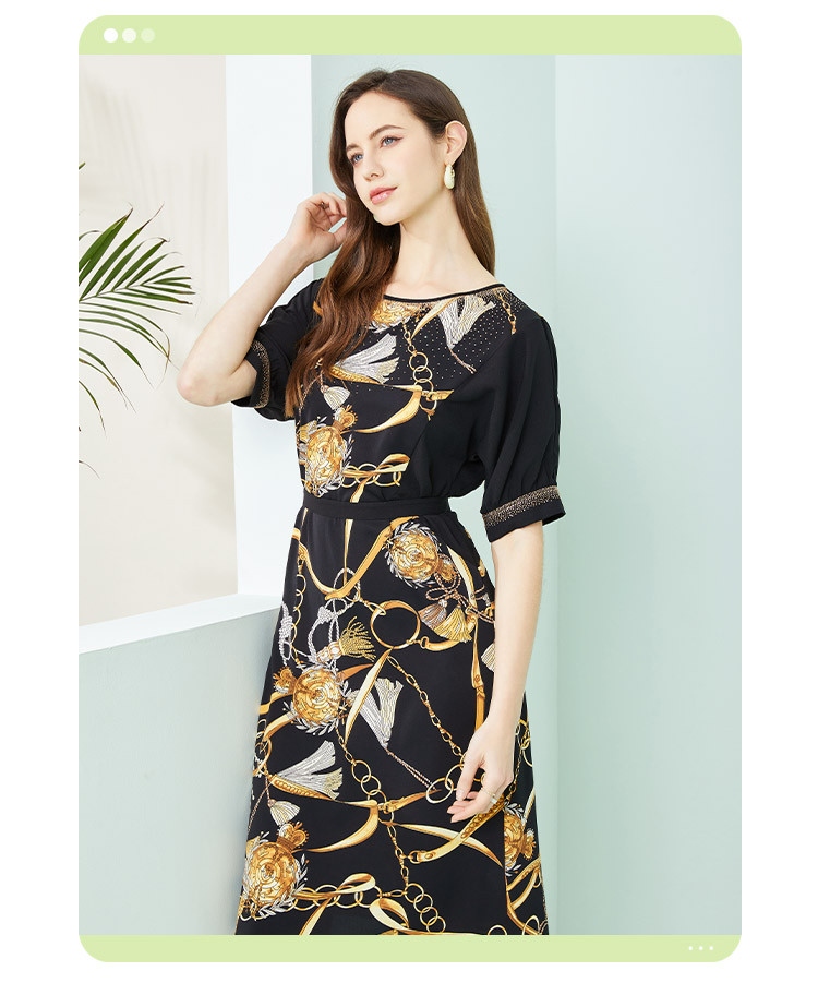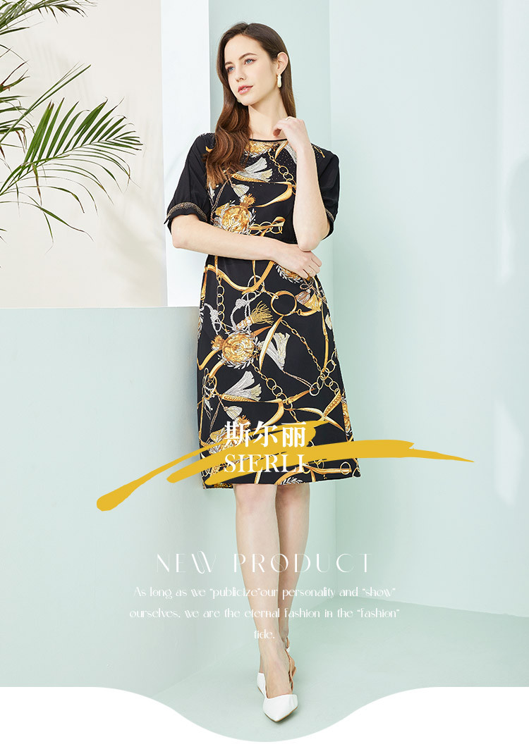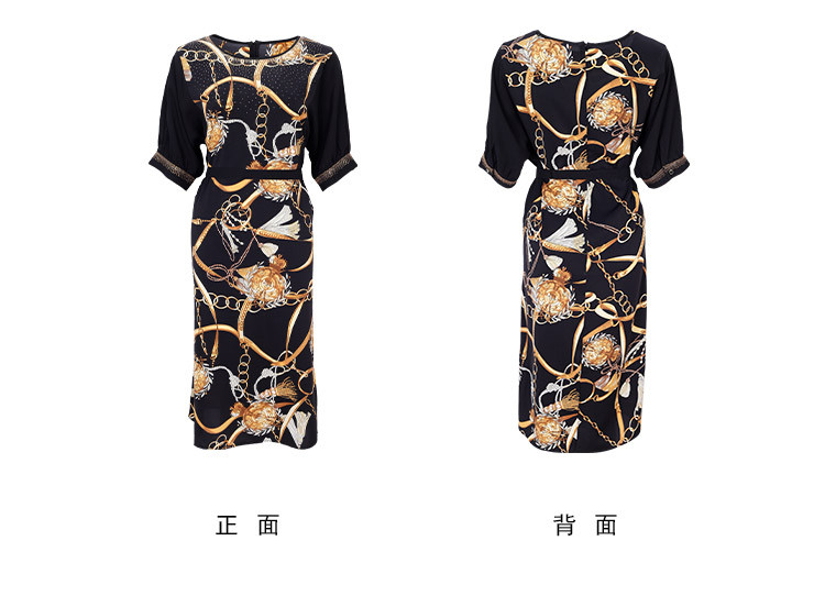 商品名称:商场同款秋季气质链条印花拼色短袖烫钻圆领连衣裙 415391