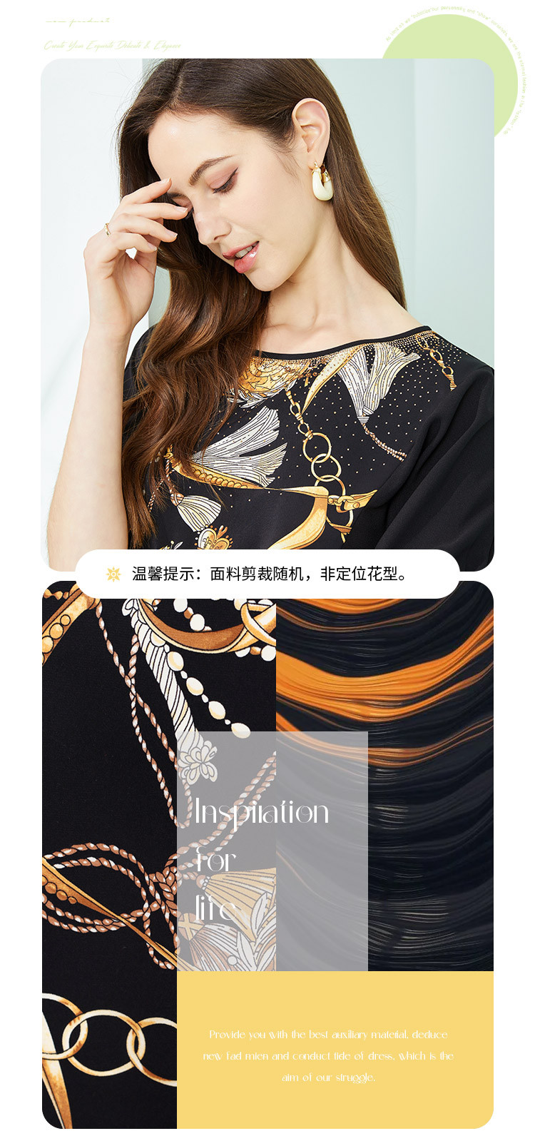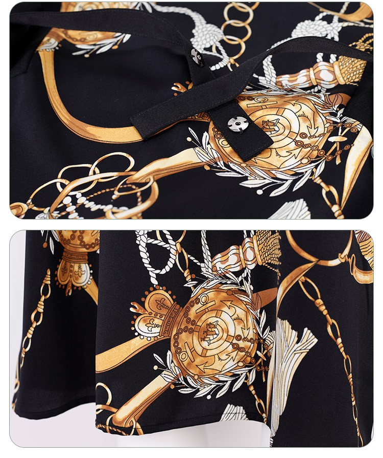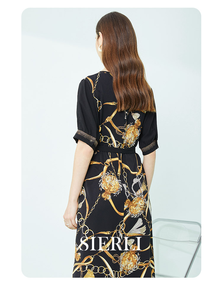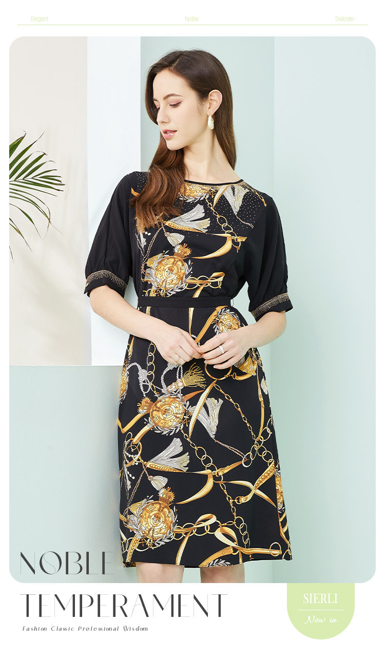 商品名称:商场同款秋季气质链条印花拼色短袖烫钻圆领连衣裙 415391