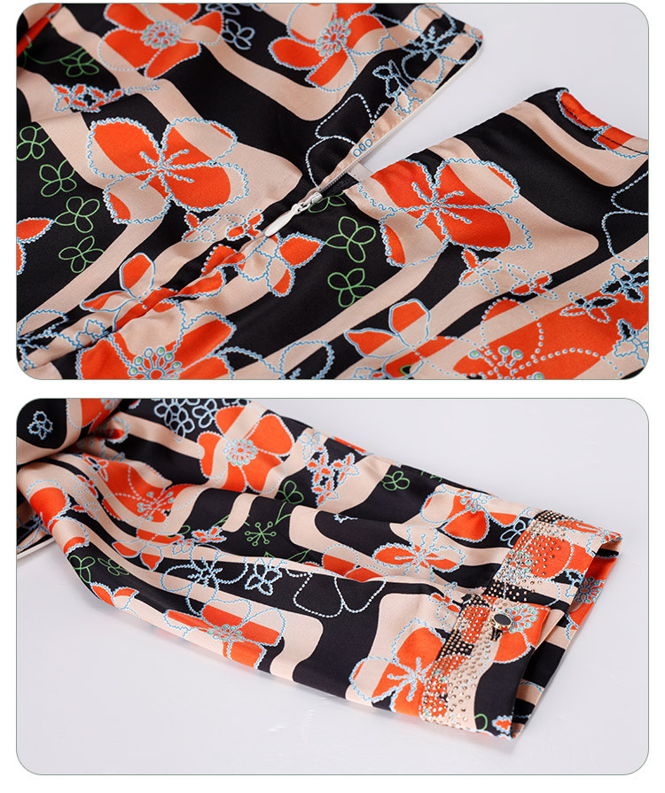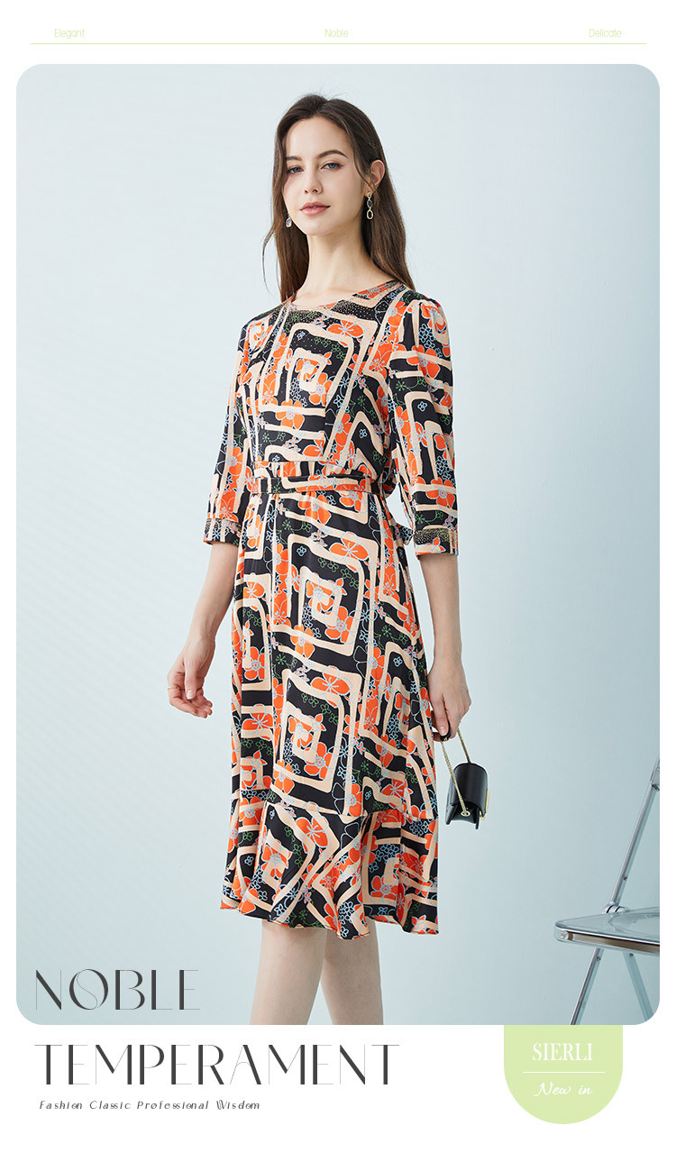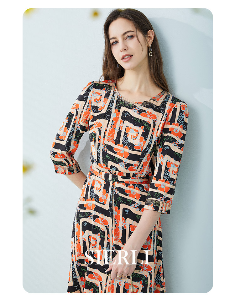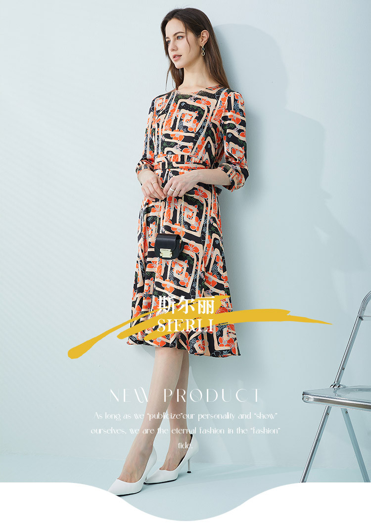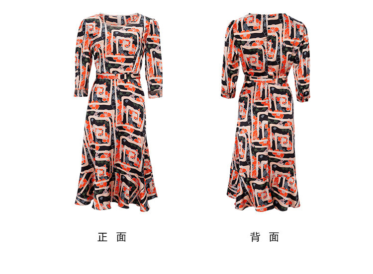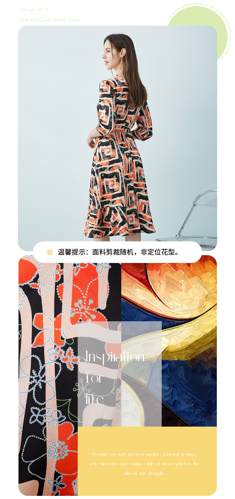 [商场同款]秋季欧美风法式印花复古撞色圆领鱼尾摆连衣裙 313247