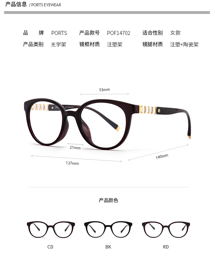 商品名称:Ports眼镜女款简约TR圆形大框眼镜架光学架POF14702 585930
