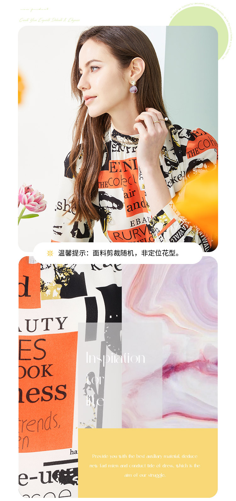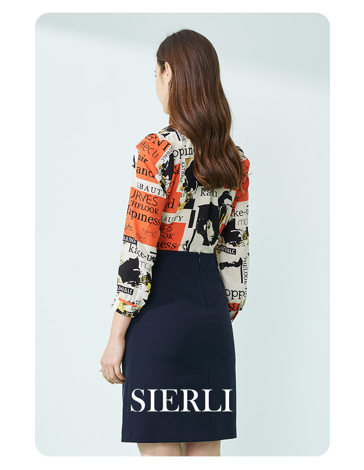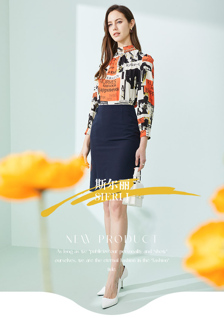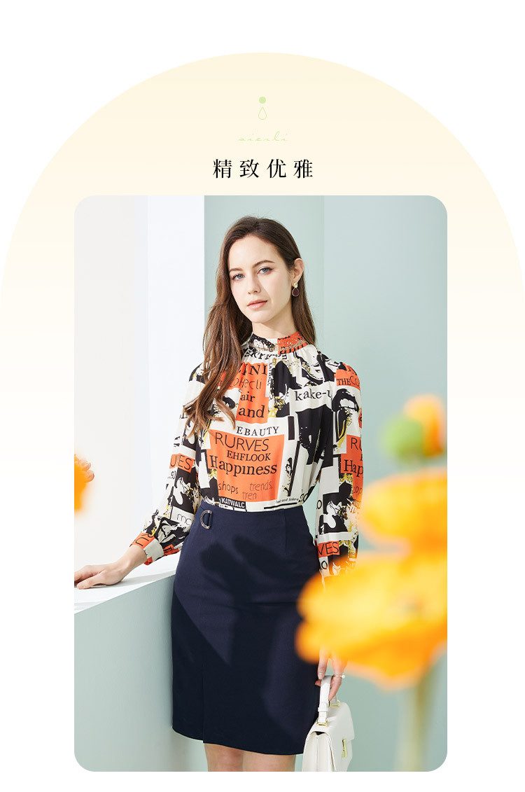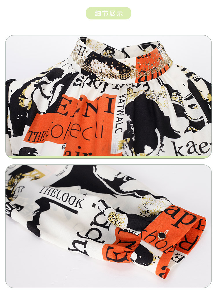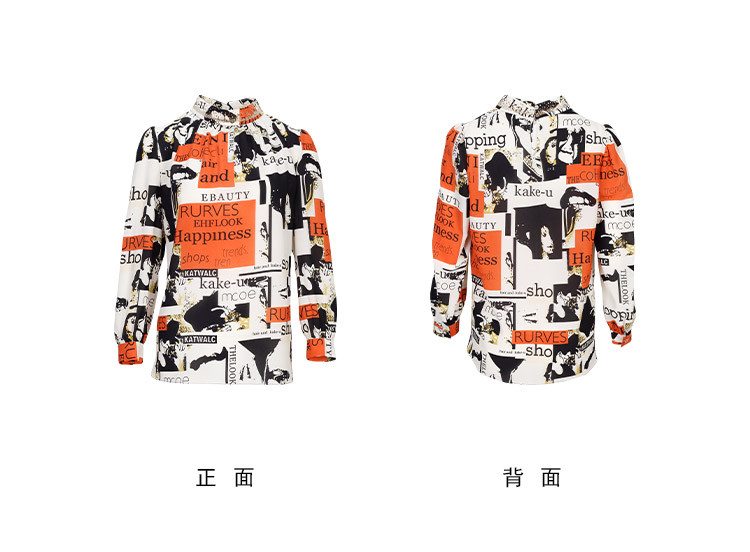 商品名称:商场同款春季欧美风法式人像字母印花立领长袖衬衣 053983