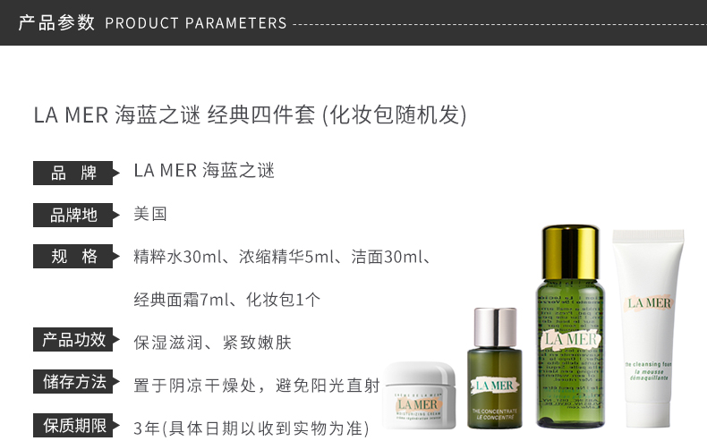 商品名称:La Mer/海蓝之谜 经典四件套 精萃水30ml+精华5ml+洁面30ml+面霜7ml
