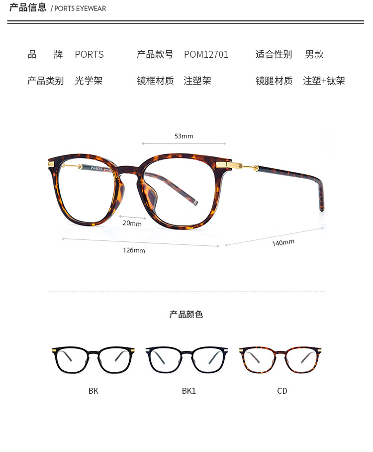 商品名称:PORTS眼镜男款板材复古男款眼镜架光学架POM12701 743178