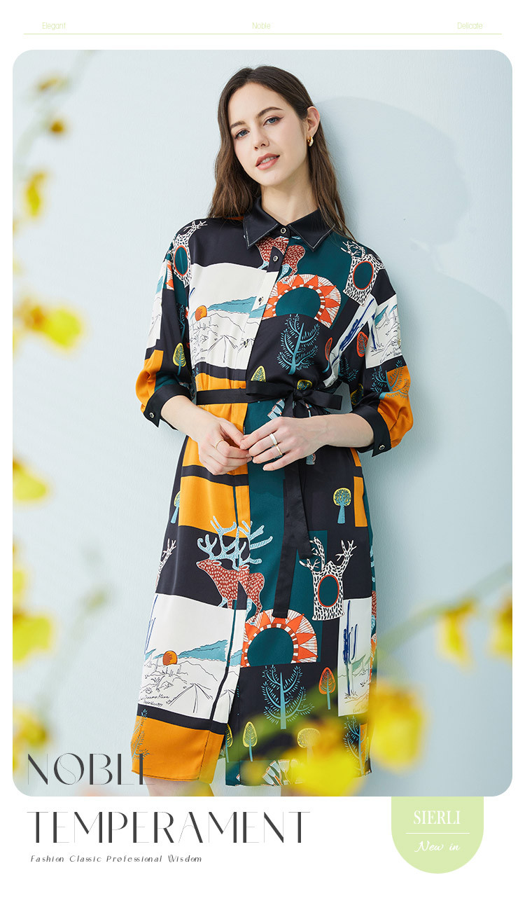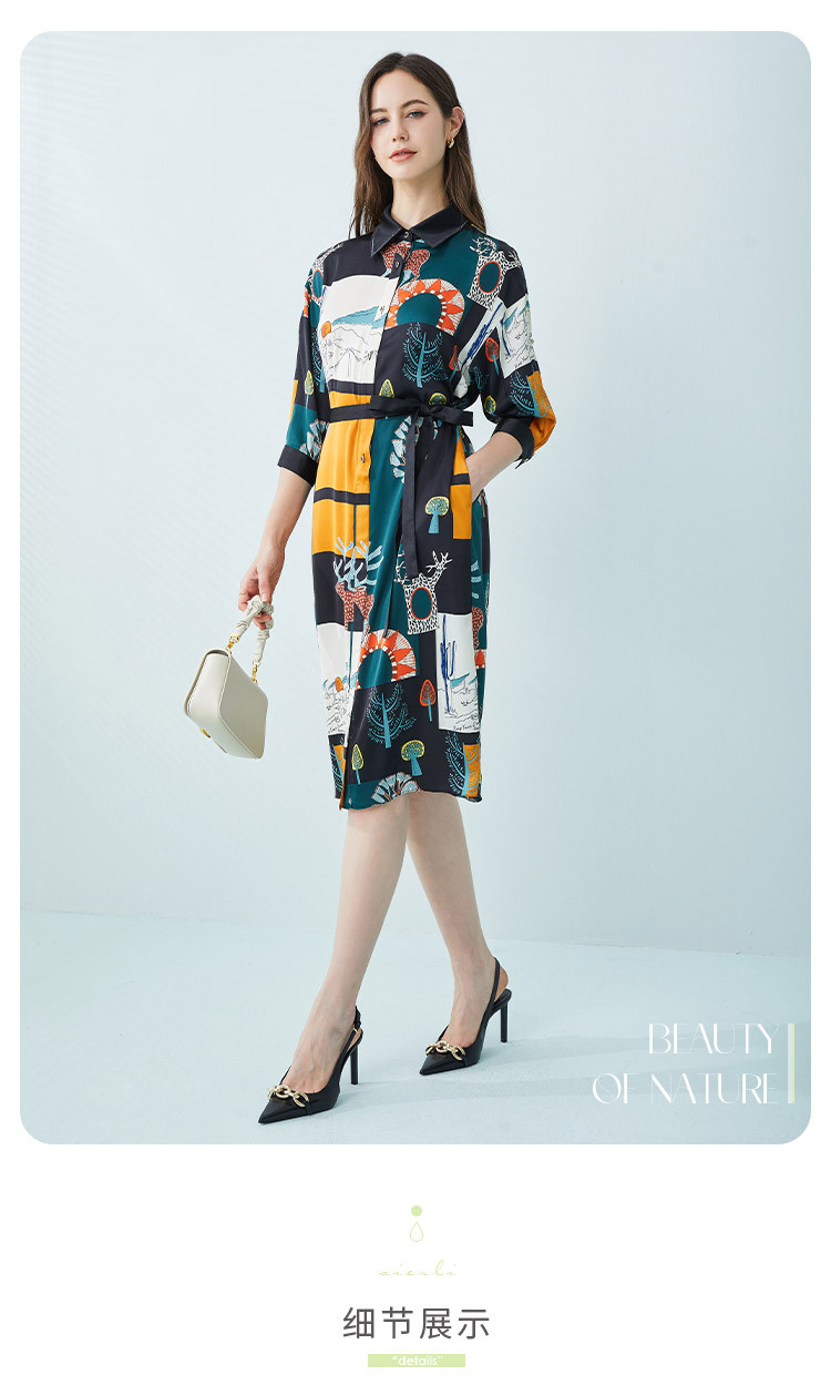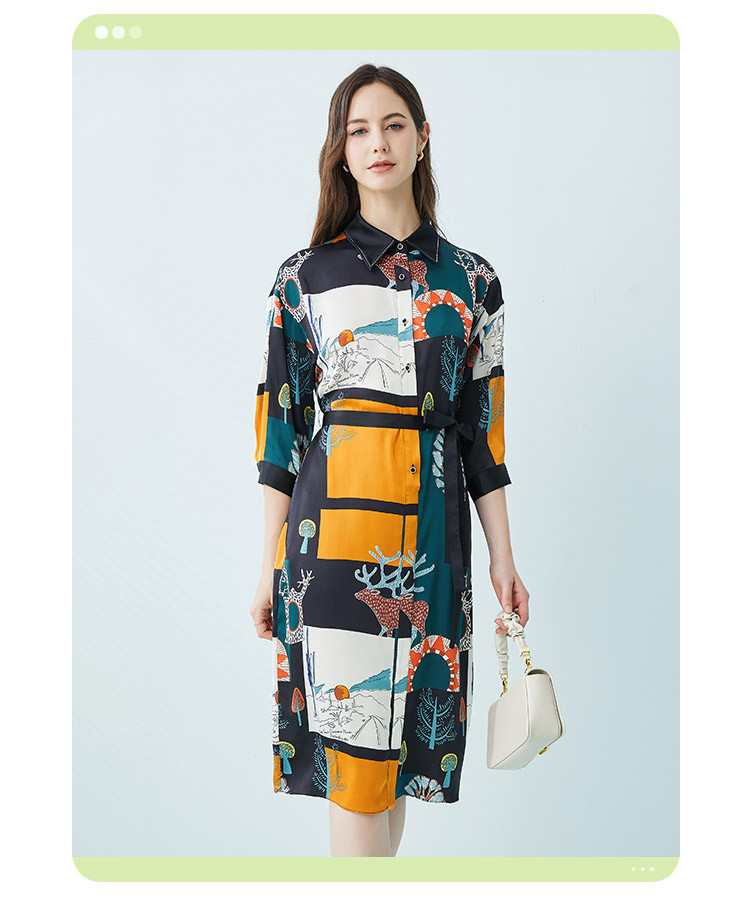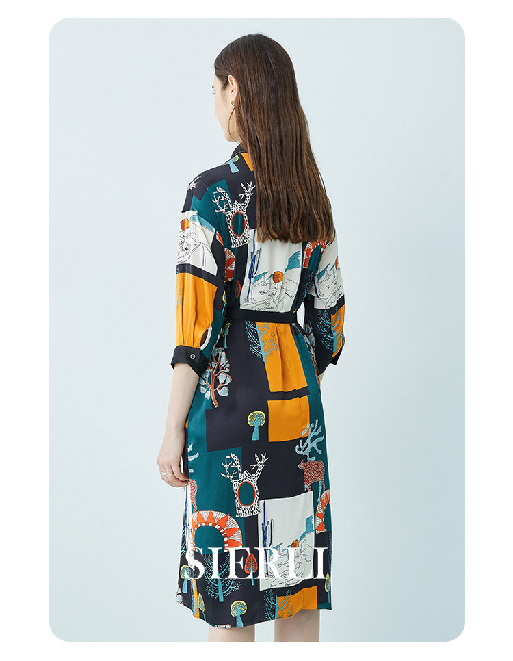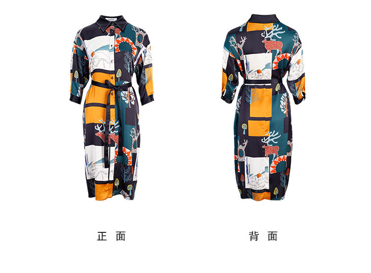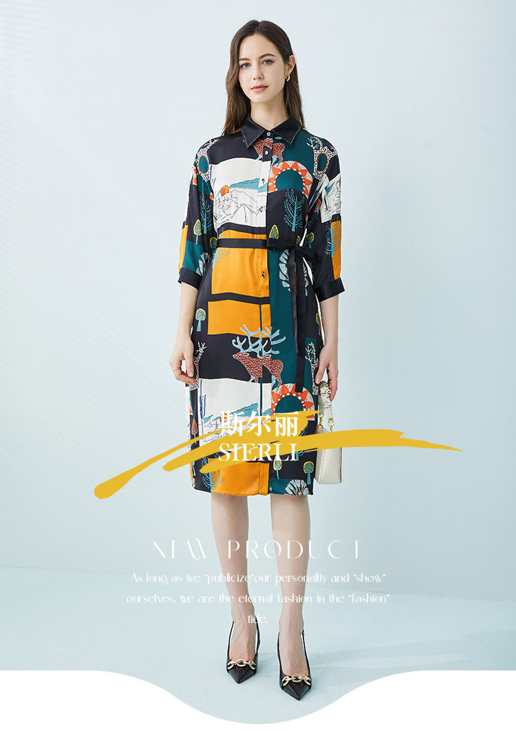 商品名称:商场同款春季法式艺术涂鸦撞色衬衫领宽松系带式连衣裙 657375