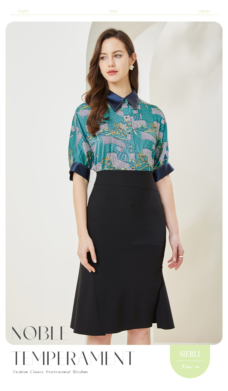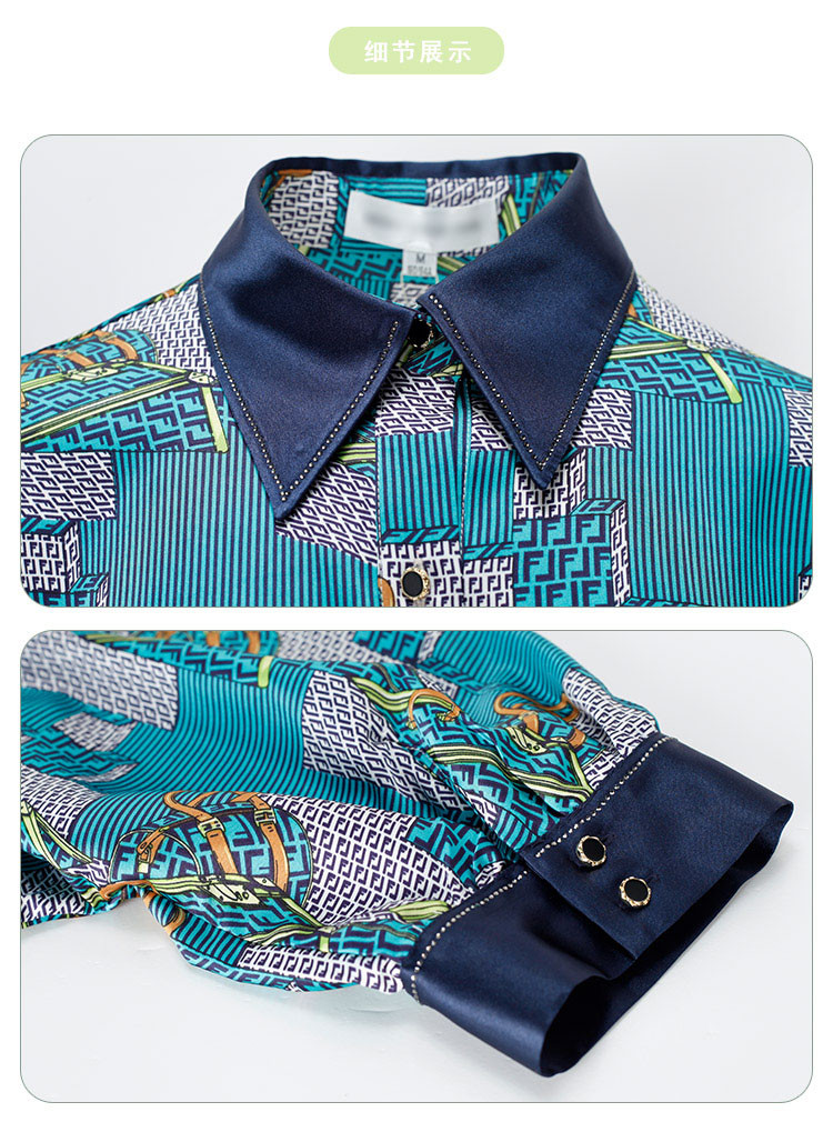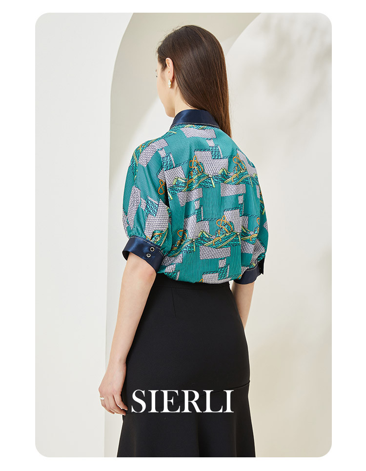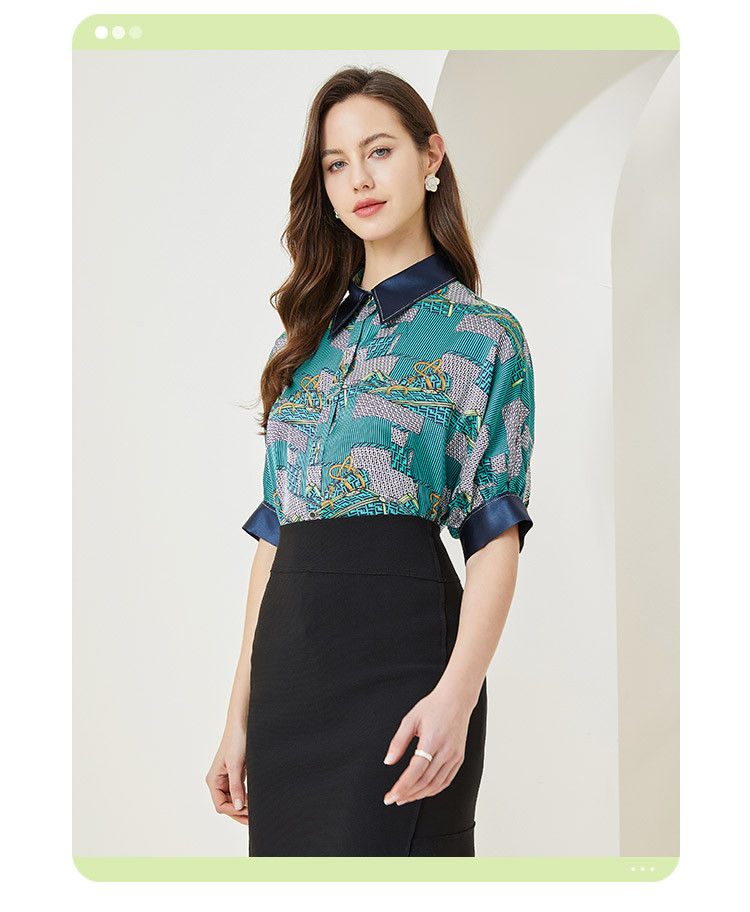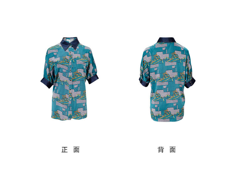 商品名称:商场同款秋季复古巴洛克印花撞色烫钻5分袖衬衣 383903