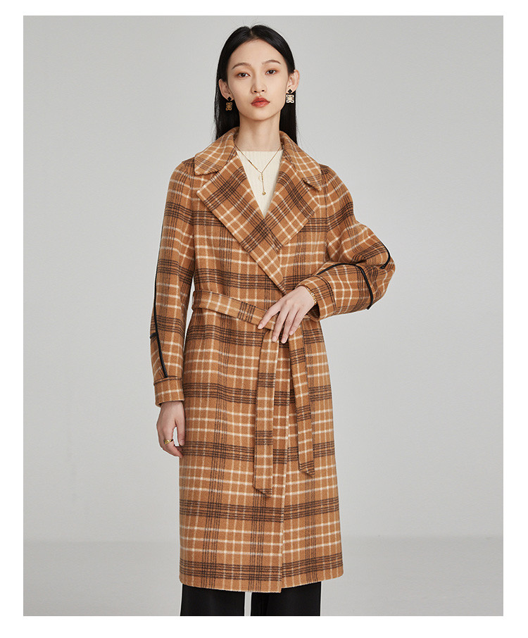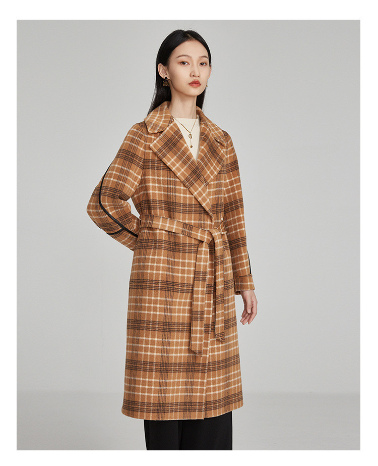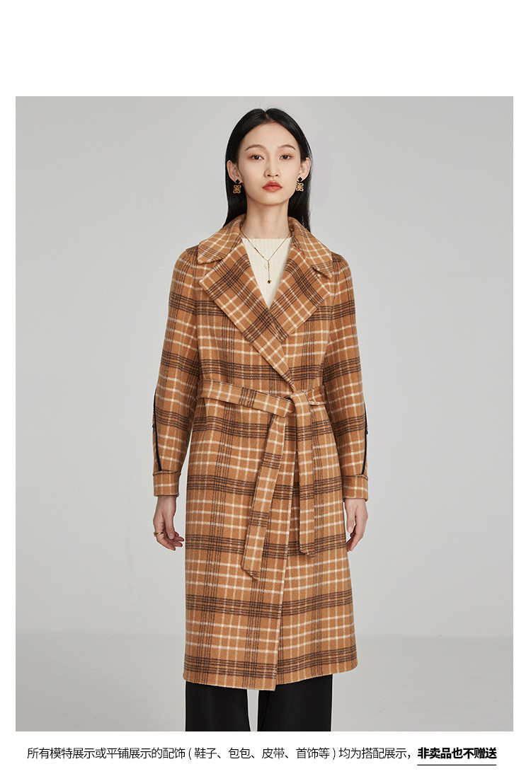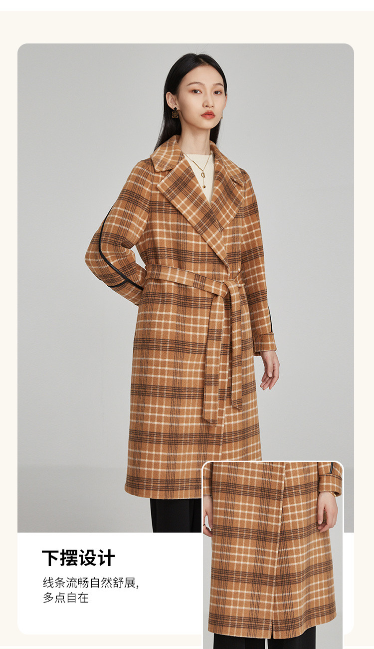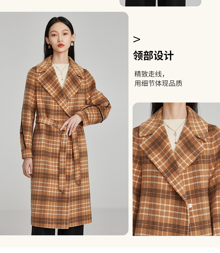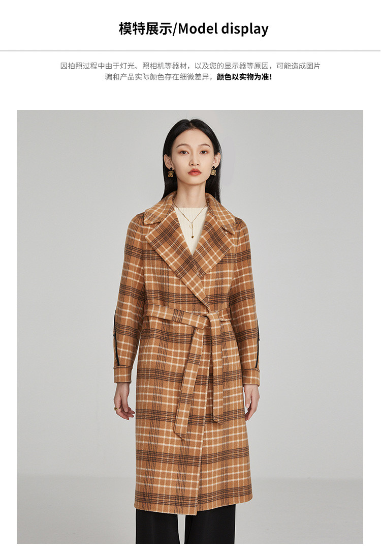 商品名称:秋冬格纹高级感羊毛大衣女式长款休闲系带双面呢外套 771039