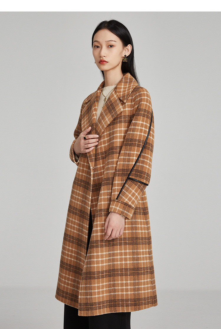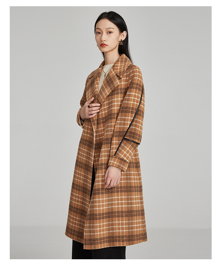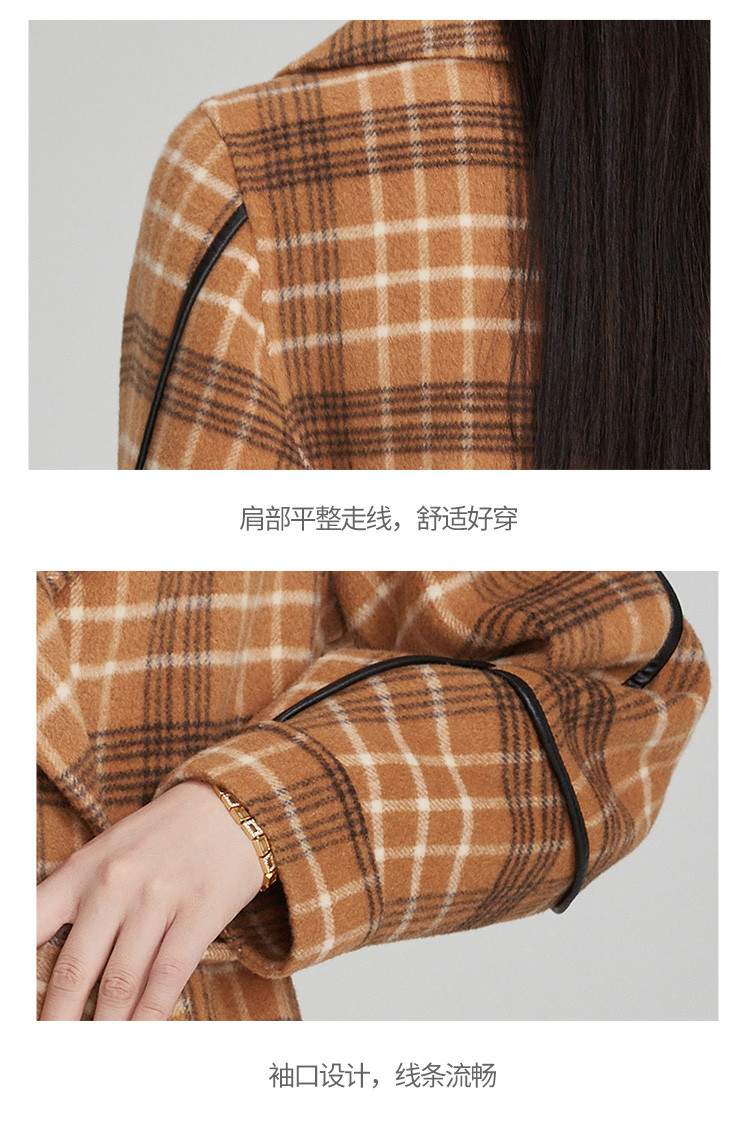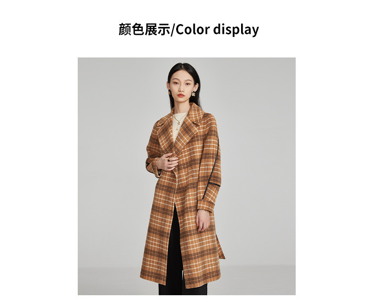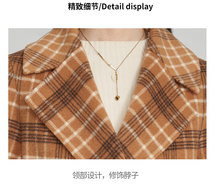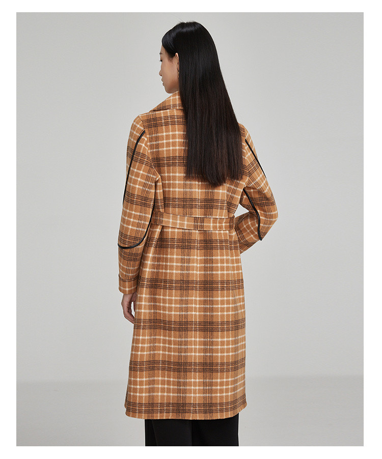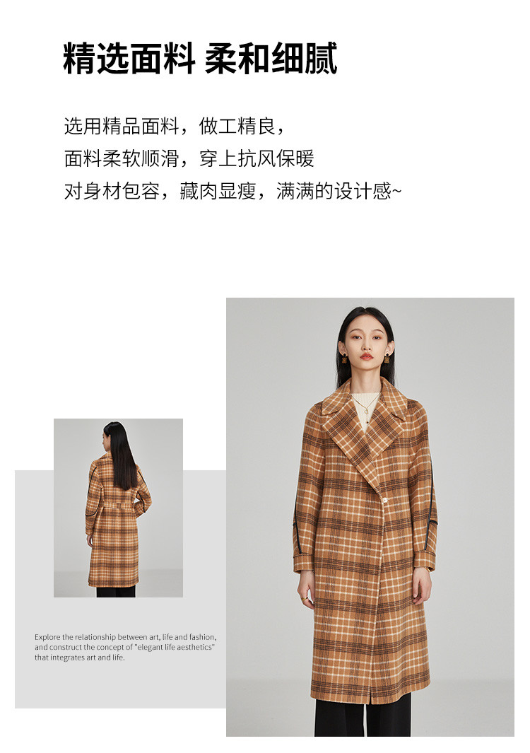 商品名称:秋冬格纹高级感羊毛大衣女式长款休闲系带双面呢外套 771039