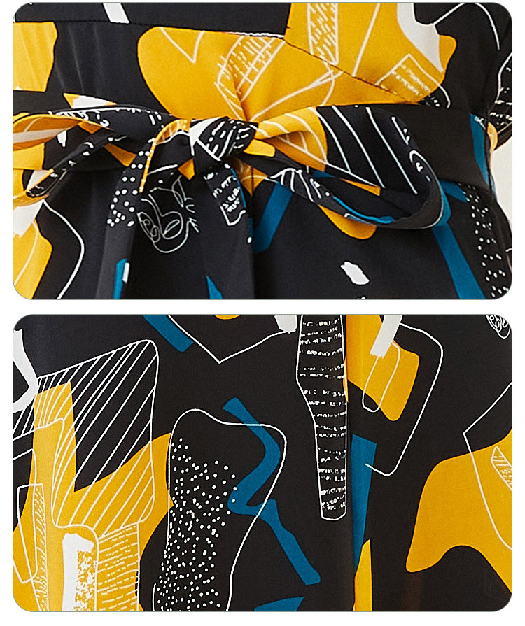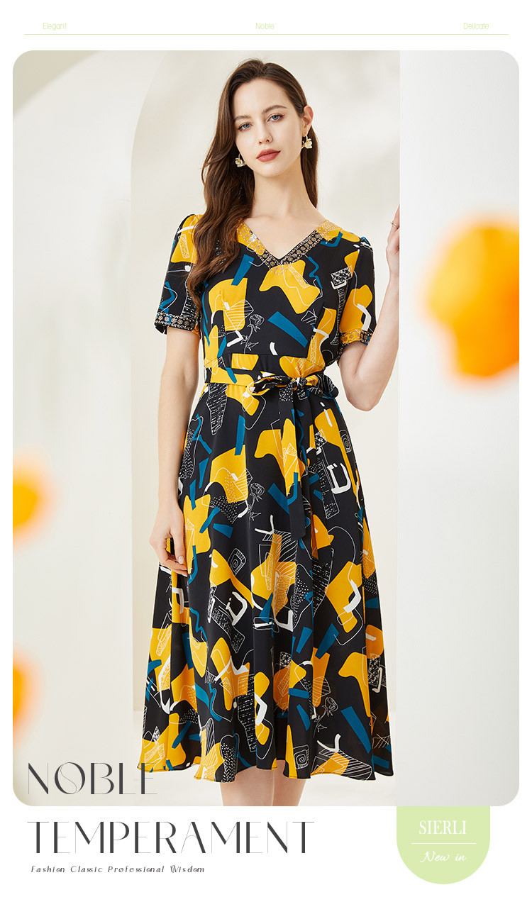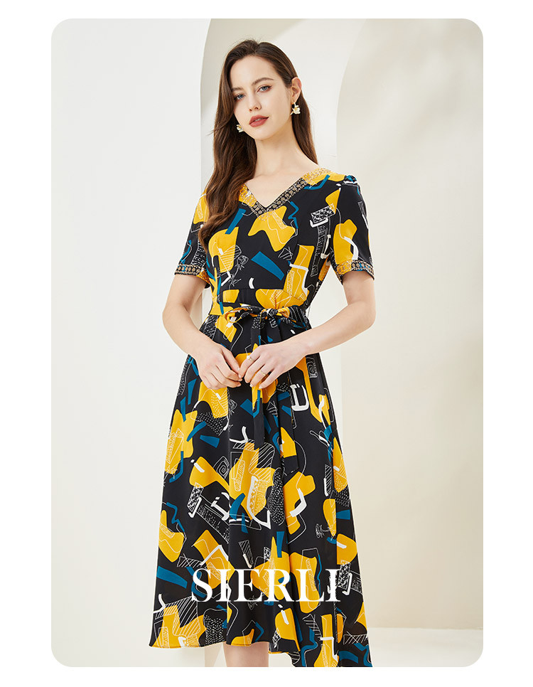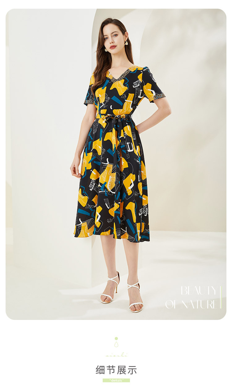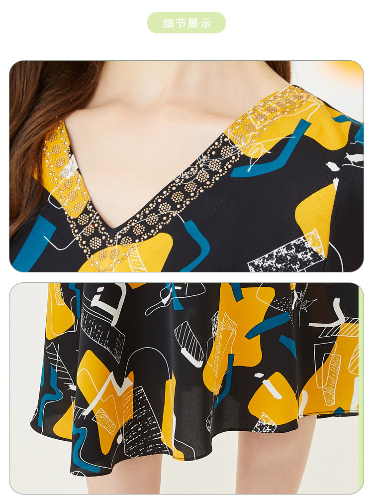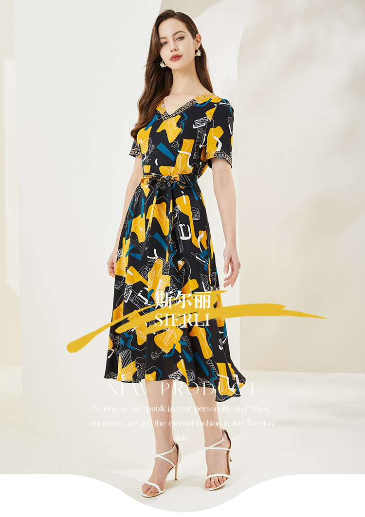 商品名称:商场同款秋季文艺不规则印花v领撞色烫钻短袖连衣裙 524447
