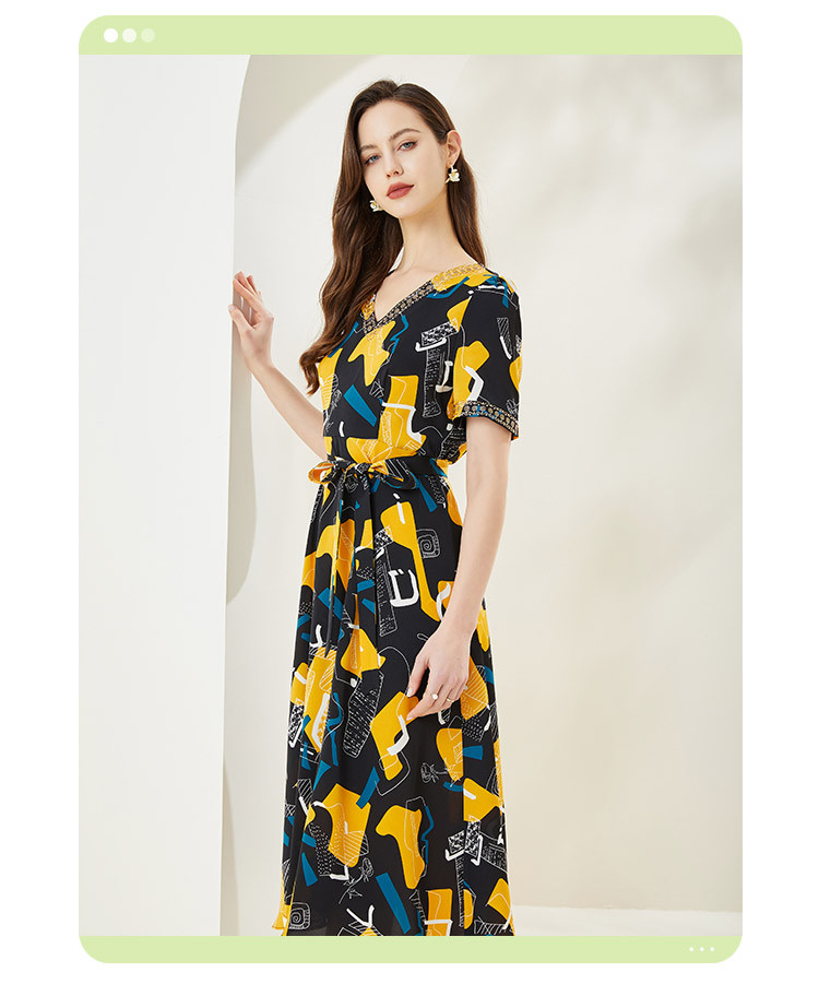商场同款秋季文艺不规则印花v领撞色烫钻短袖连衣裙 524447
