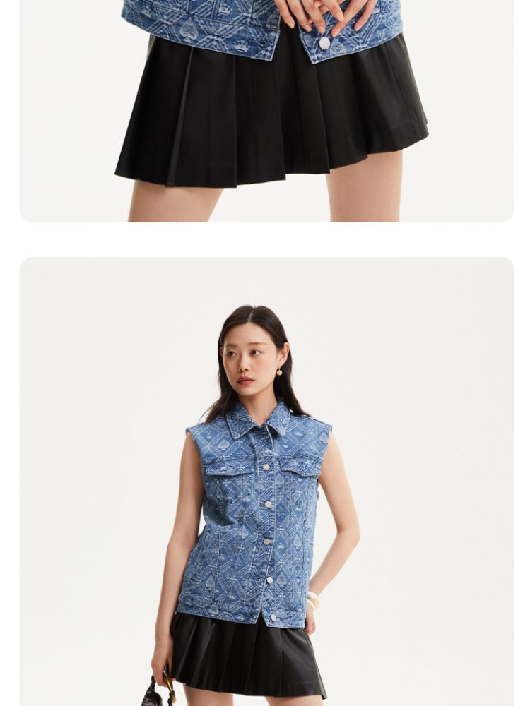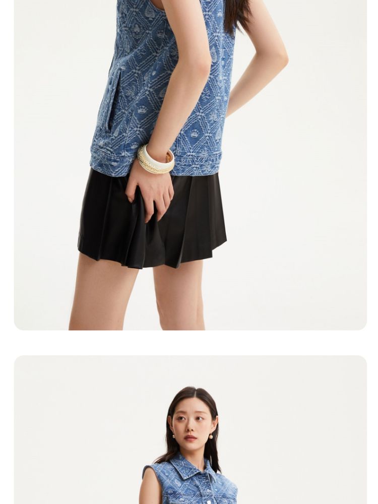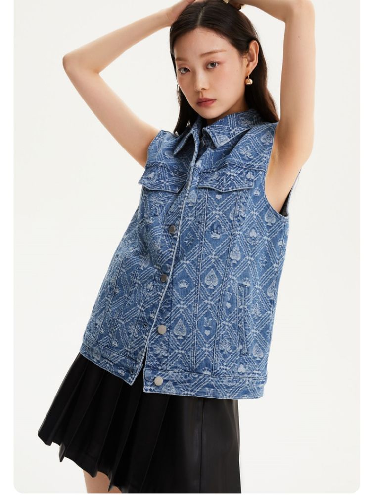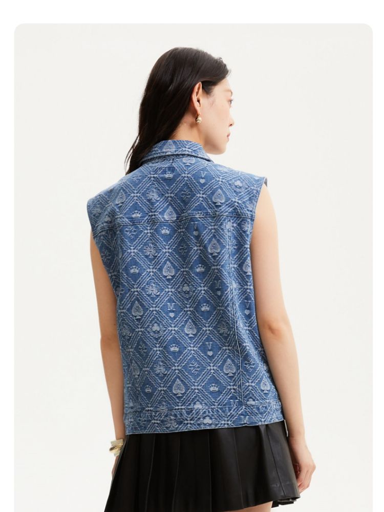 【时髦牛仔马甲】春夏专柜款宽松翻领印花无袖背心女气质百搭时尚 760081