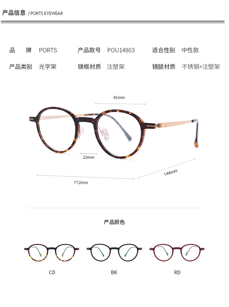 商品名称:Ports眼镜男女款韩版圆框复古文艺眼镜架光学架 136458