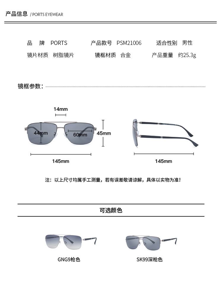 商品名称:Ports眼镜男款经典双梁商务方框太阳镜PSM21006 784714