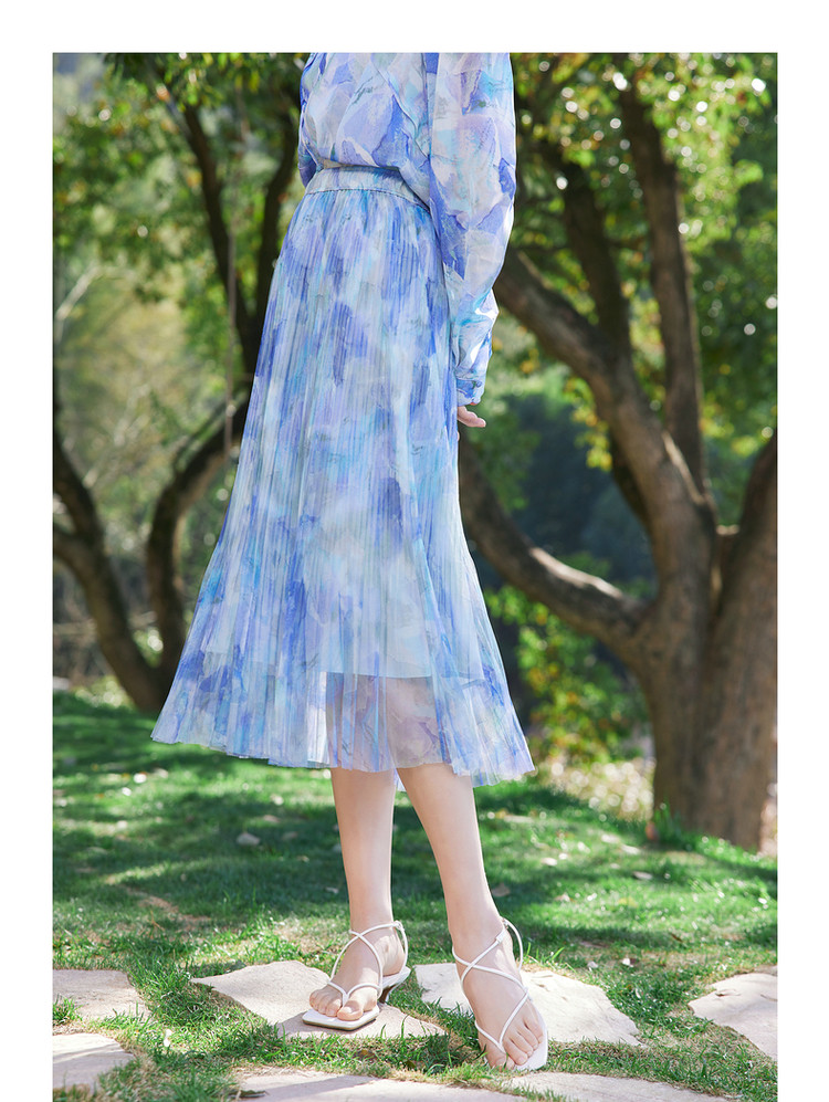 玖姿旗下安娜蔻系列网布印花压褶伞裙女装夏季 半身裙 110476