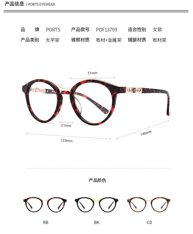 商品名称:Ports眼镜女款简约板材复古眼镜架光学架POF13709 314058