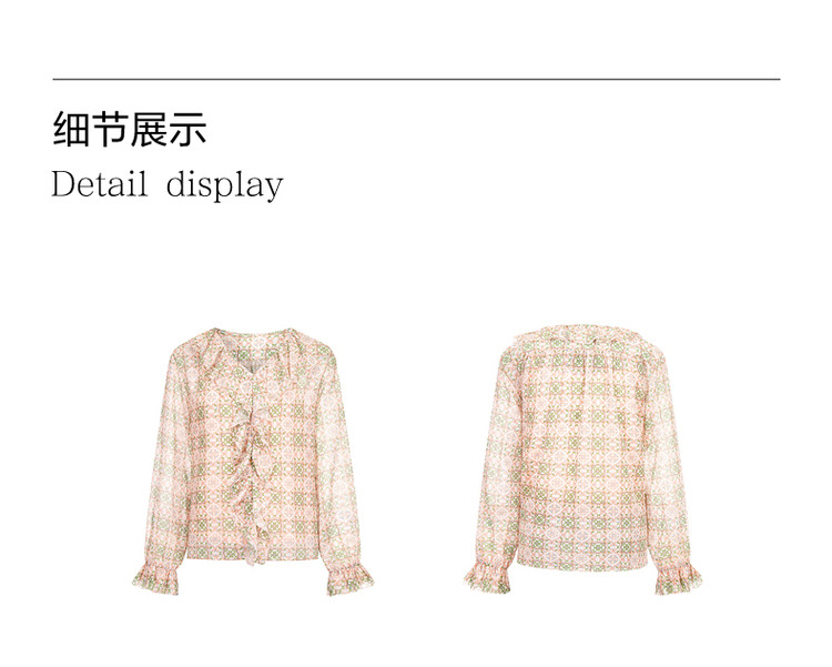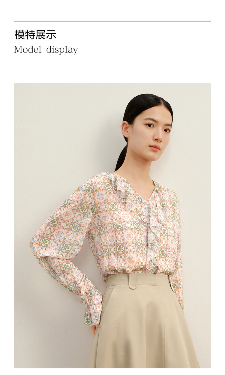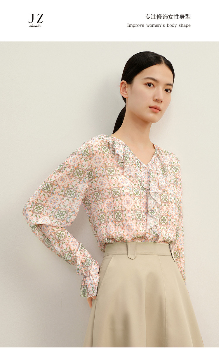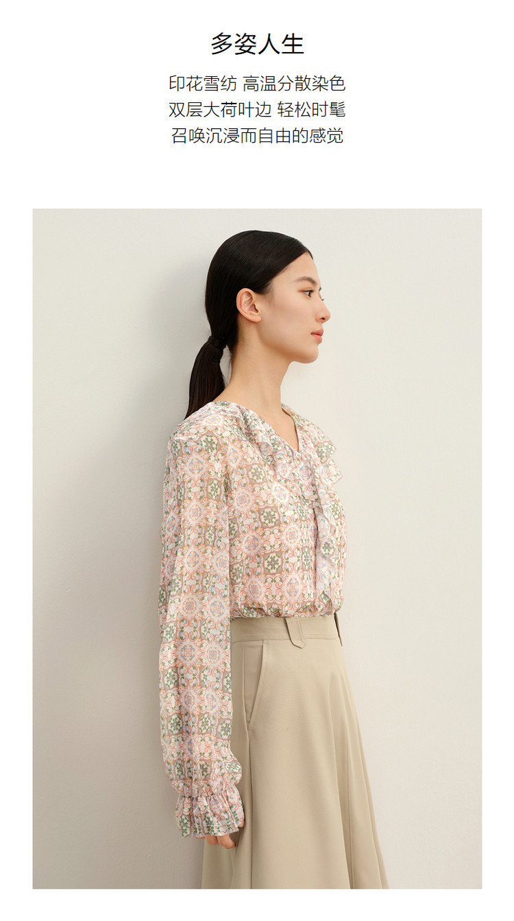商品名称:玖姿旗下安娜蔻系列洋气复古荷叶边雪纺印花长袖上衣女秋季 711500