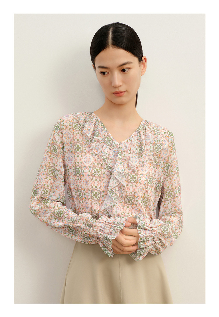 玖姿旗下安娜蔻系列洋气复古荷叶边雪纺印花长袖上衣女秋季 711500