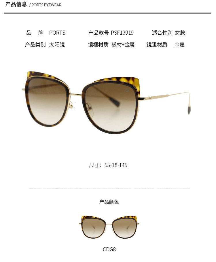 PORTS女款经典板材灵动猫耳框女士太阳镜PSF13919 128330