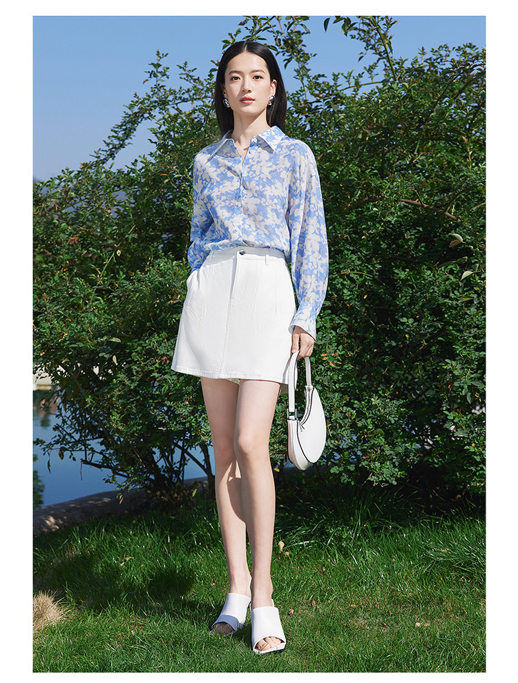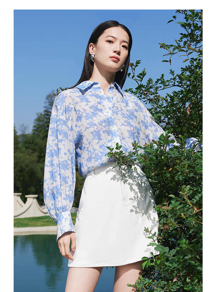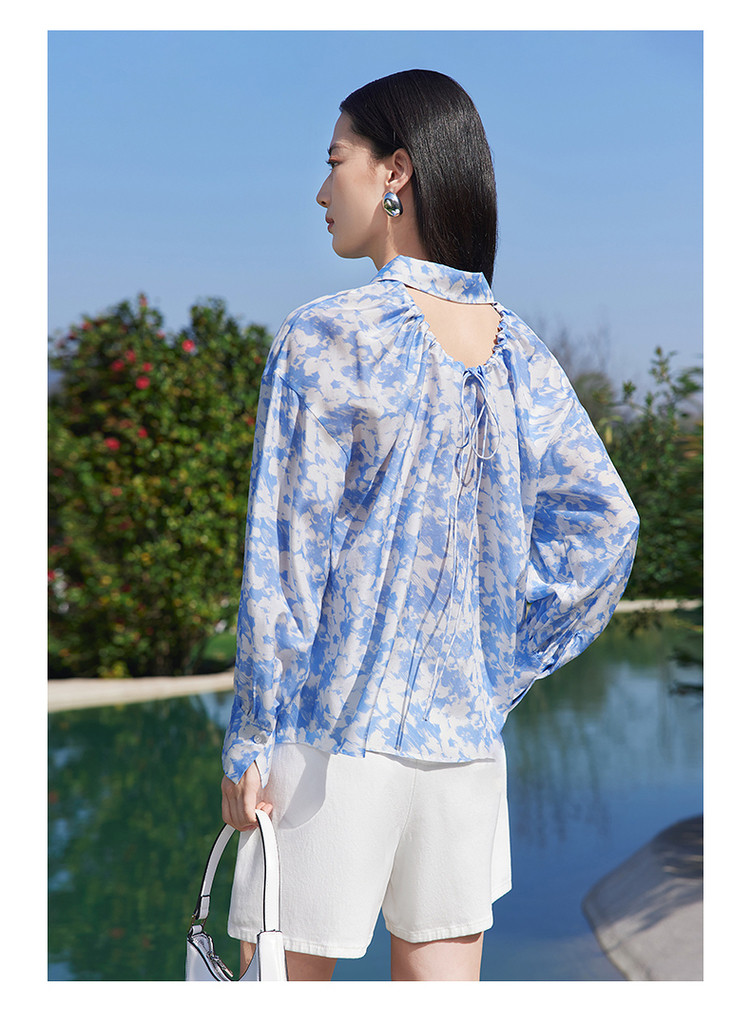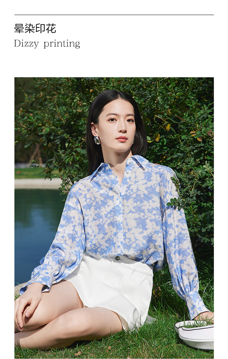 玖姿旗下安娜蔻系列镂空长袖衬衫女装夏季晕染印花休闲上衣 451212