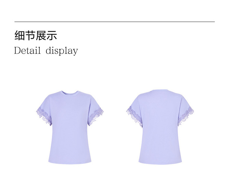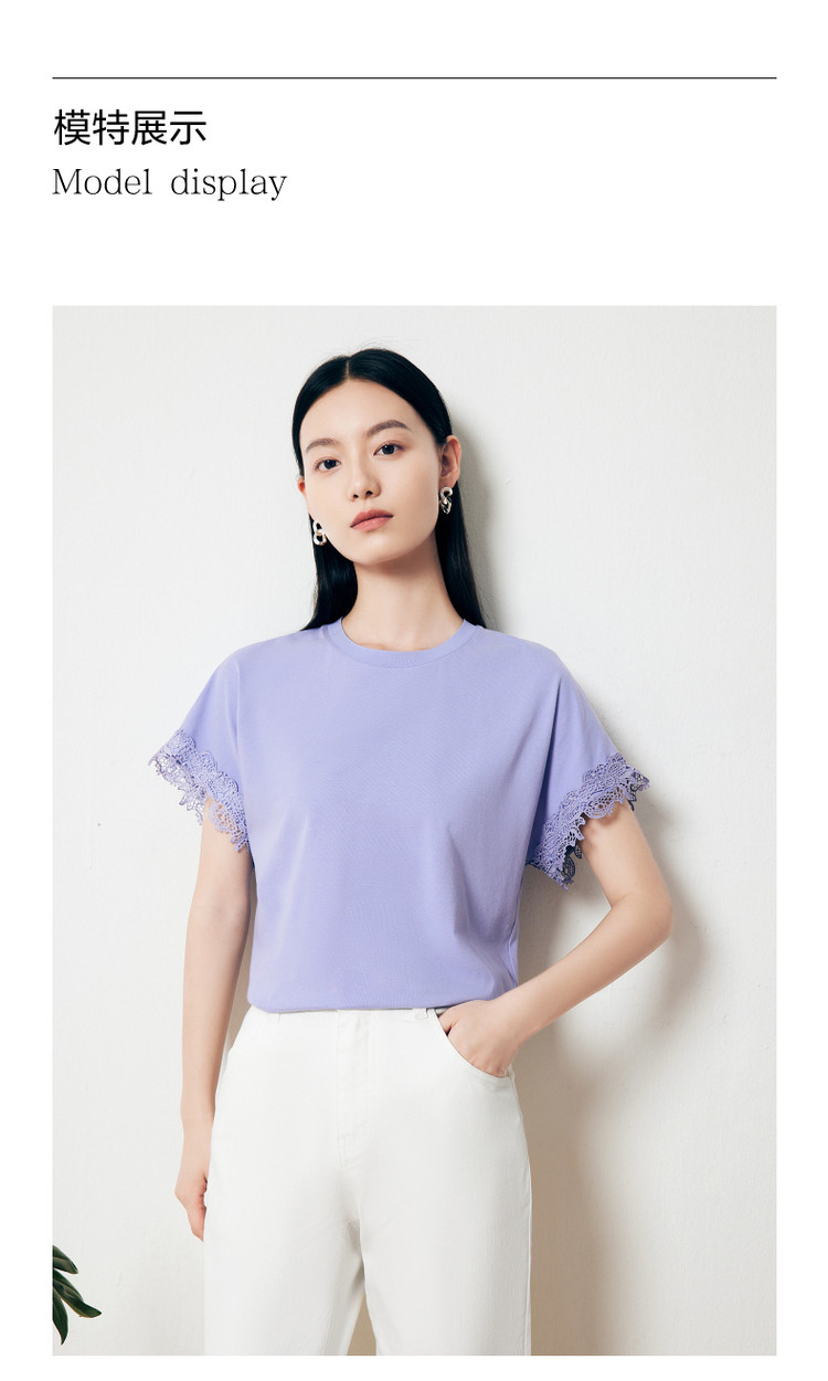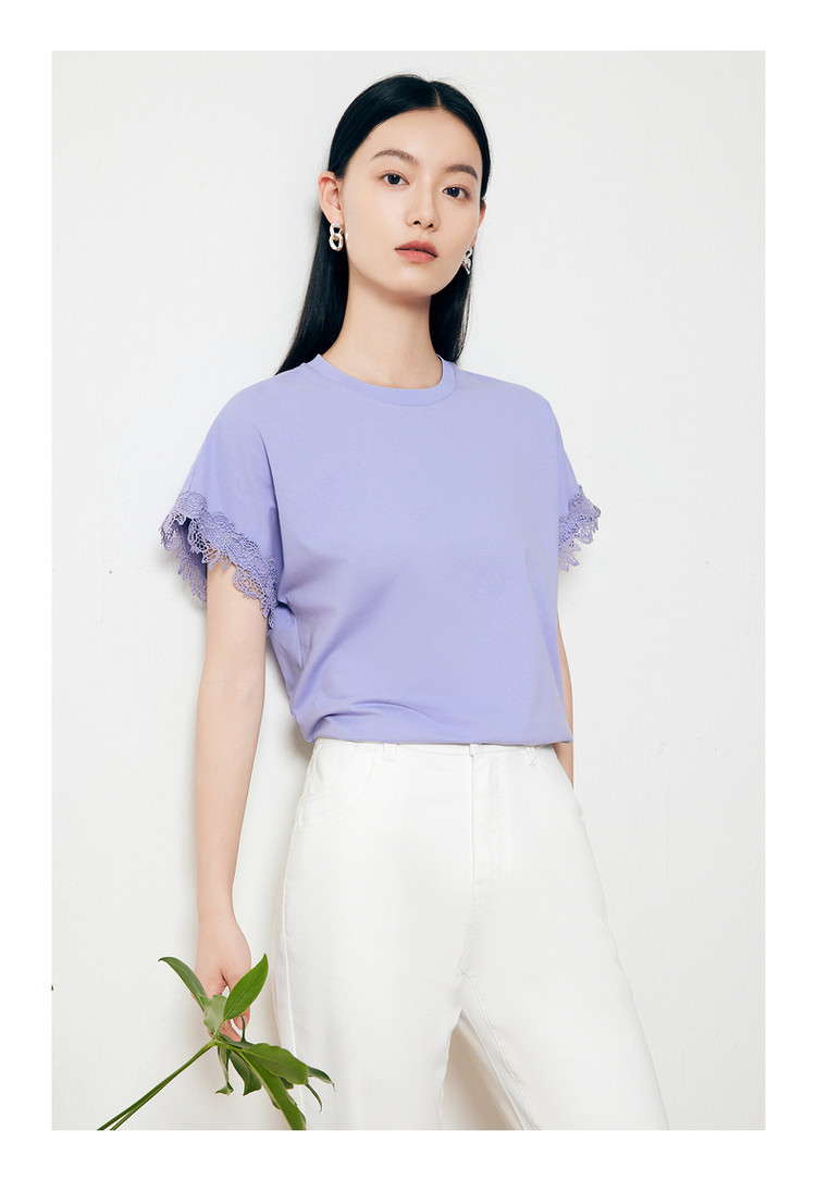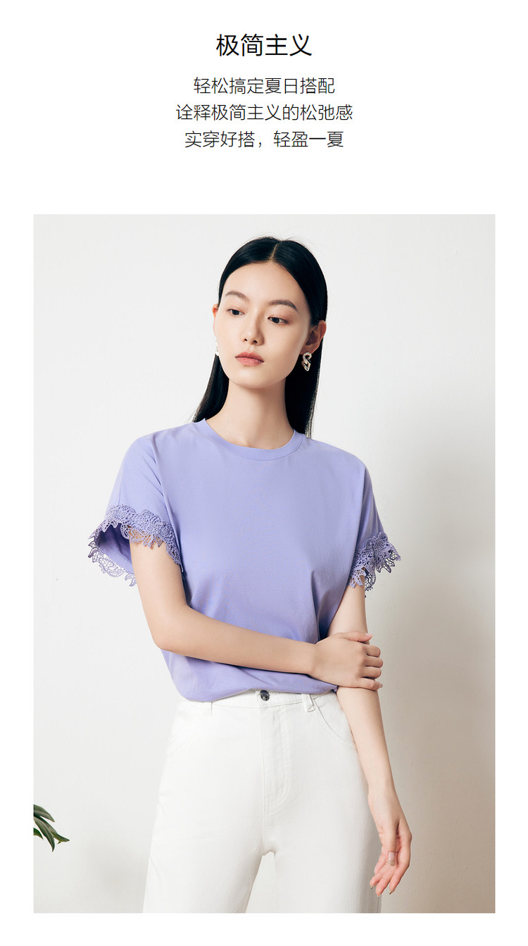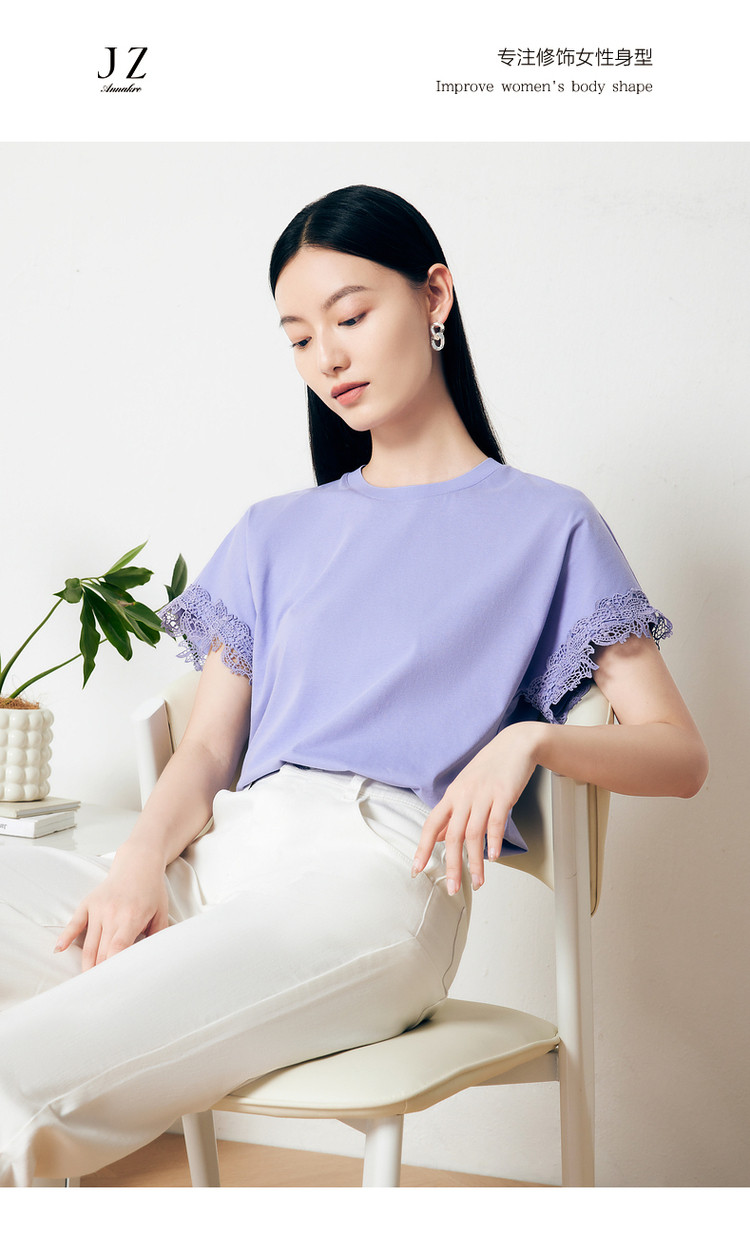 商品名称:玖姿旗下安娜蔻系列轻熟休闲风直筒蕾丝纯色短袖套头T恤女夏季 440140