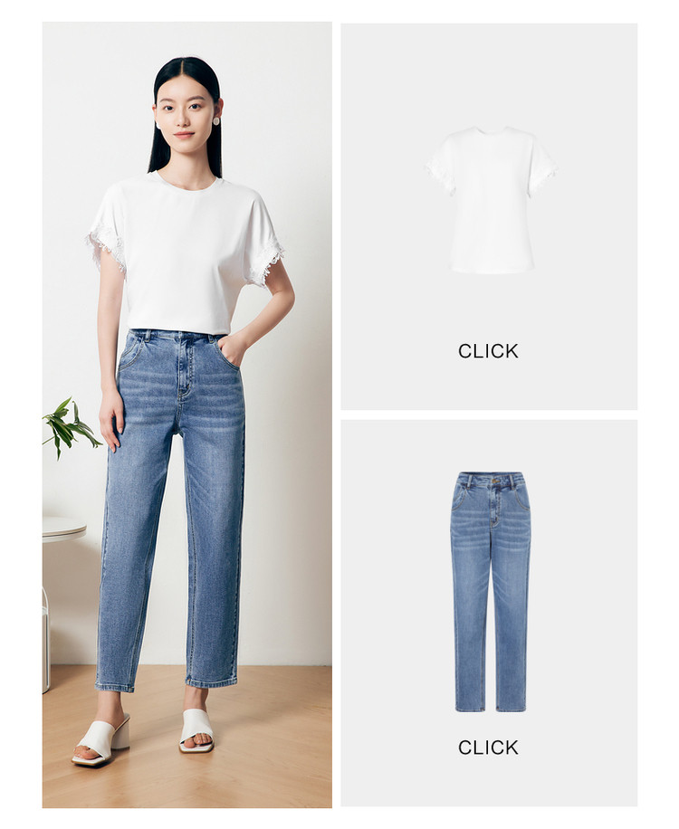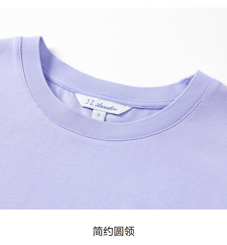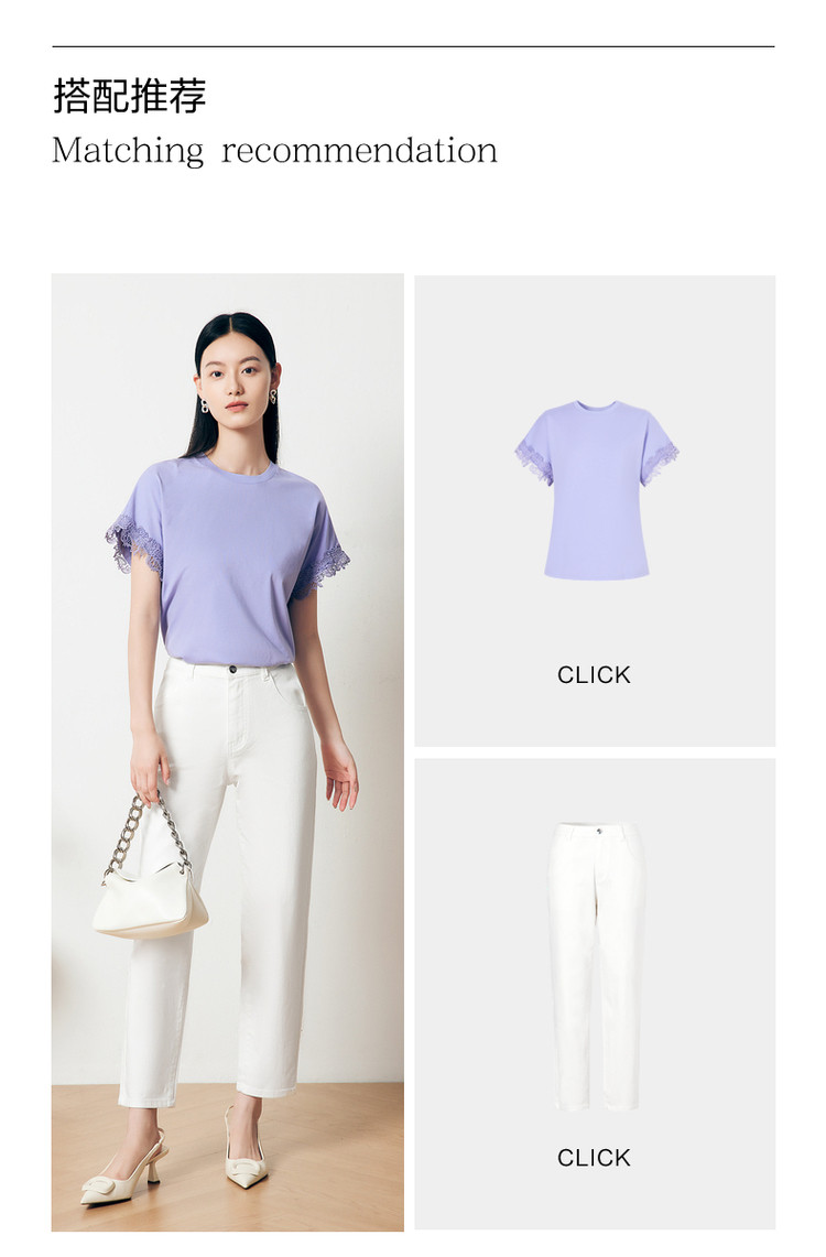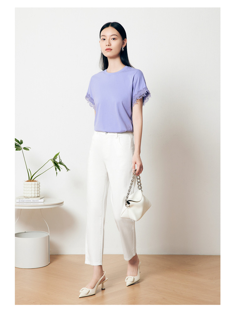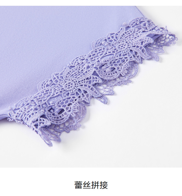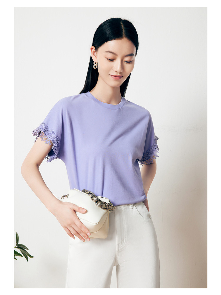 商品名称:玖姿旗下安娜蔻系列轻熟休闲风直筒蕾丝纯色短袖套头T恤女夏季 440140