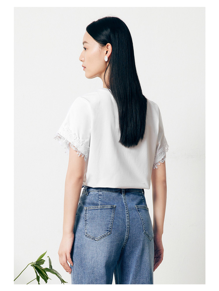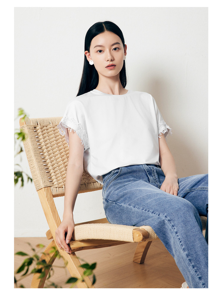 玖姿旗下安娜蔻系列轻熟休闲风直筒蕾丝纯色短袖套头T恤女夏季 440140