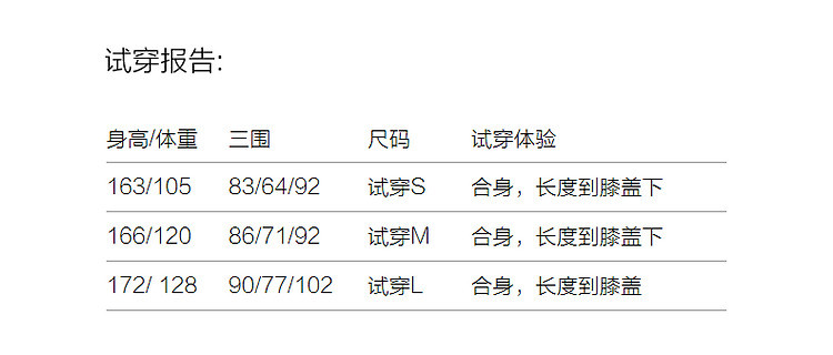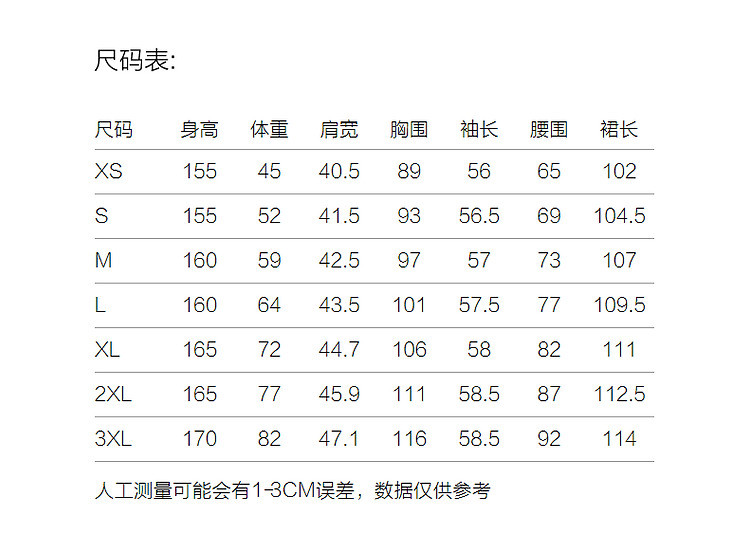 | 尺码 | 裙长(cm) | 肩宽(cm) | 腰围(cm) | 袖长(cm) | 胸围(cm) | 号型 |