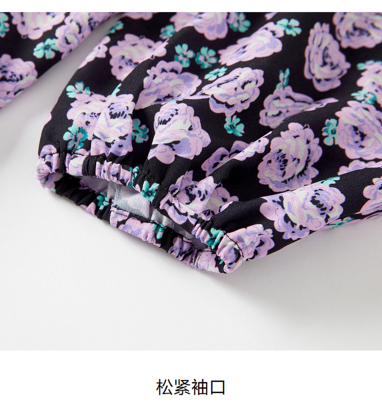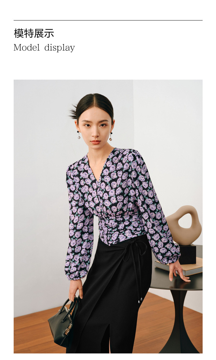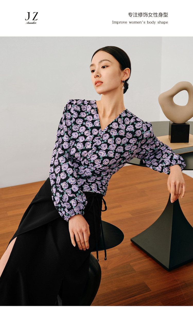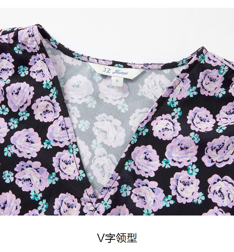商品名称:玖姿旗下安娜蔻系列V领优雅法式复古X型雪纺印花长袖上衣女秋季 906892