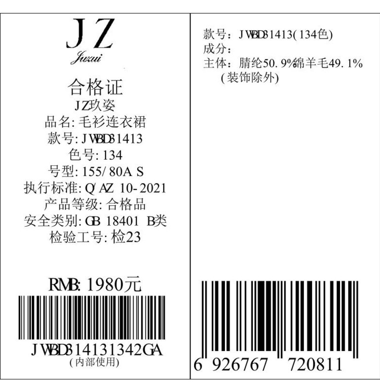 商品名称:商场同款JZ玖姿趣味印花针织连衣裙女冬季JWBD31413 759244