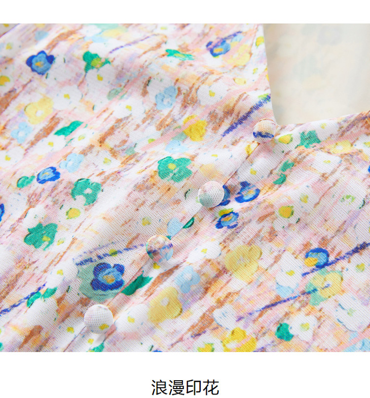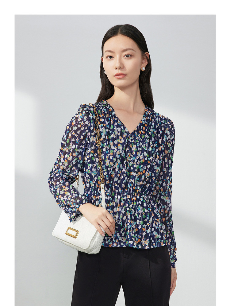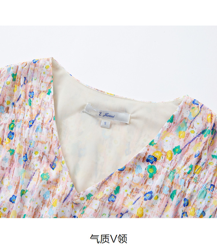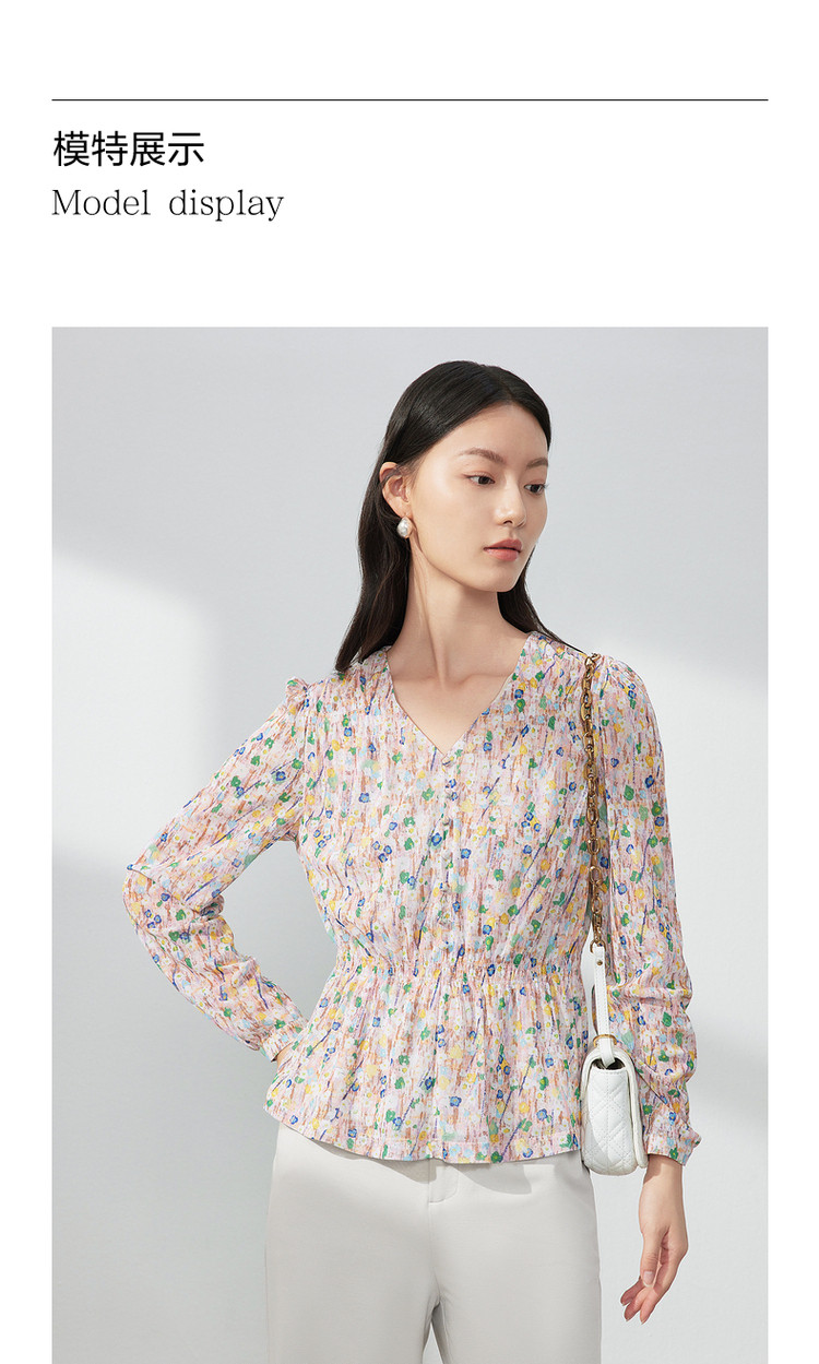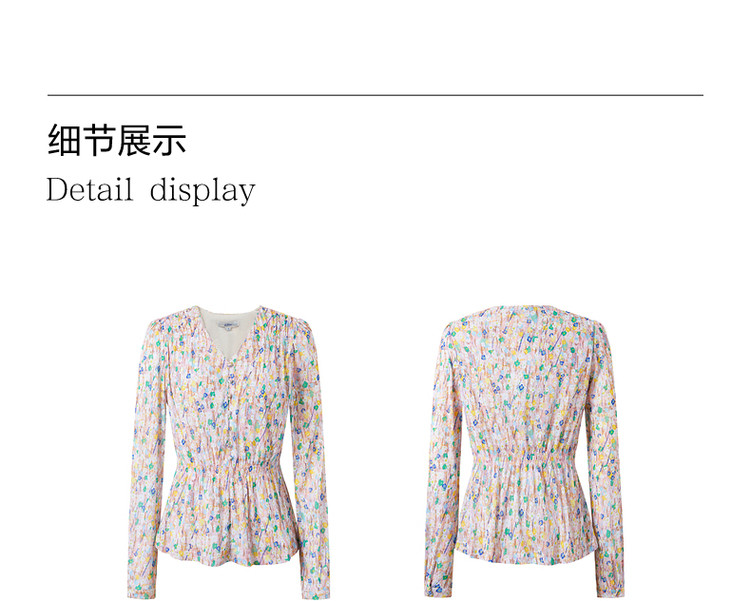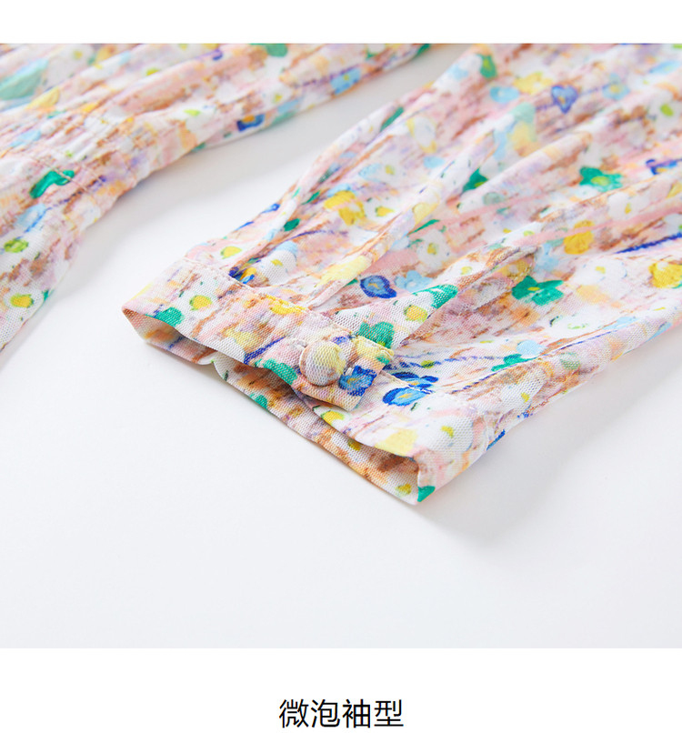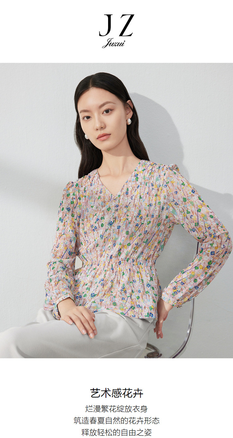 商品名称:JZ玖姿度假风碎花女装春季法式V领网纱套头衫 082956