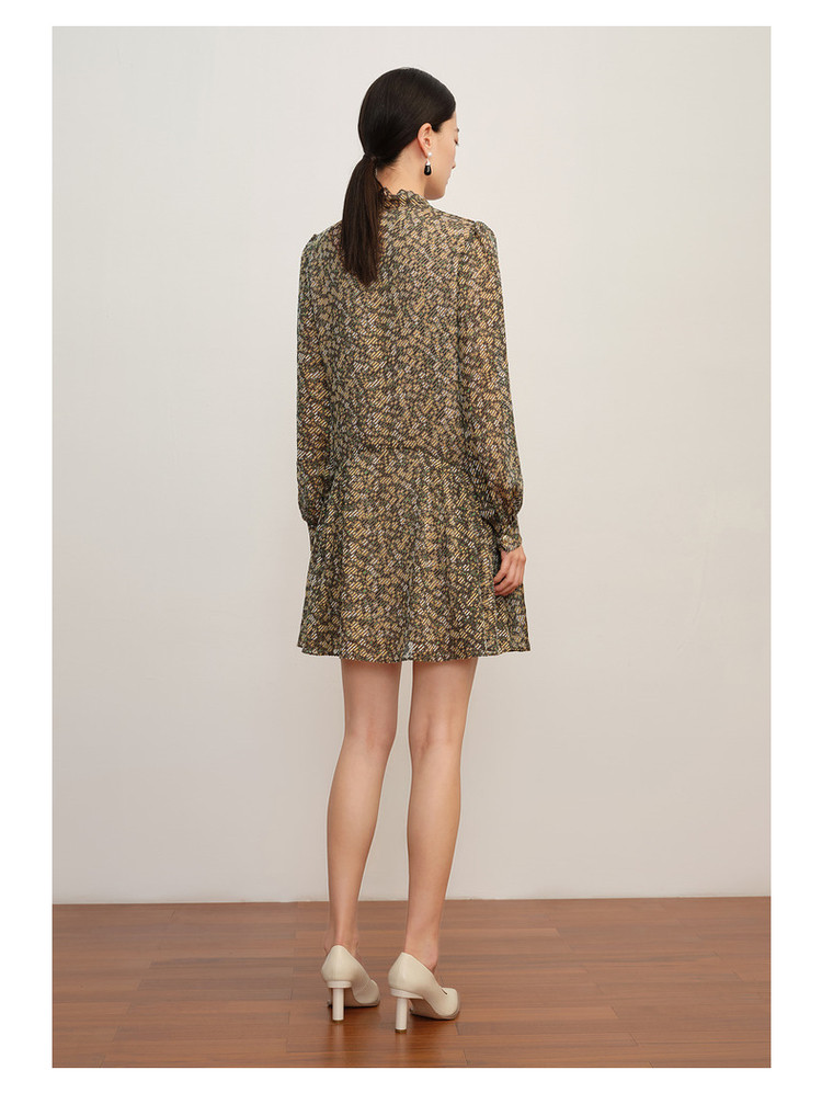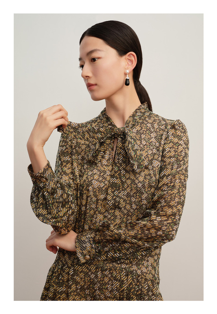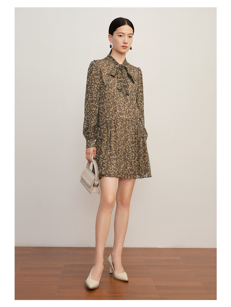 玖姿旗下安娜蔻系列宽松休闲碎花飘带领蝴蝶结烧花连衣裙女秋 265996