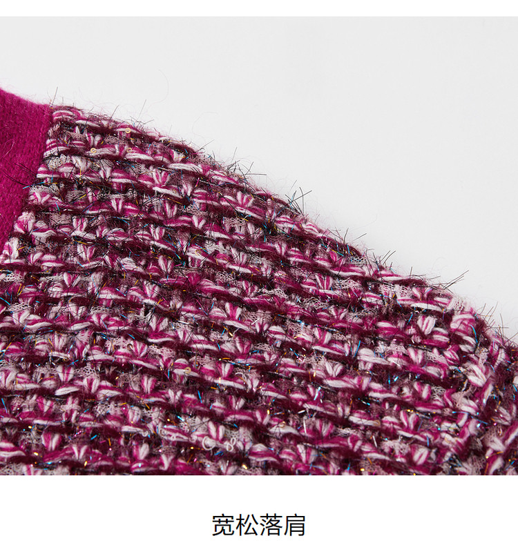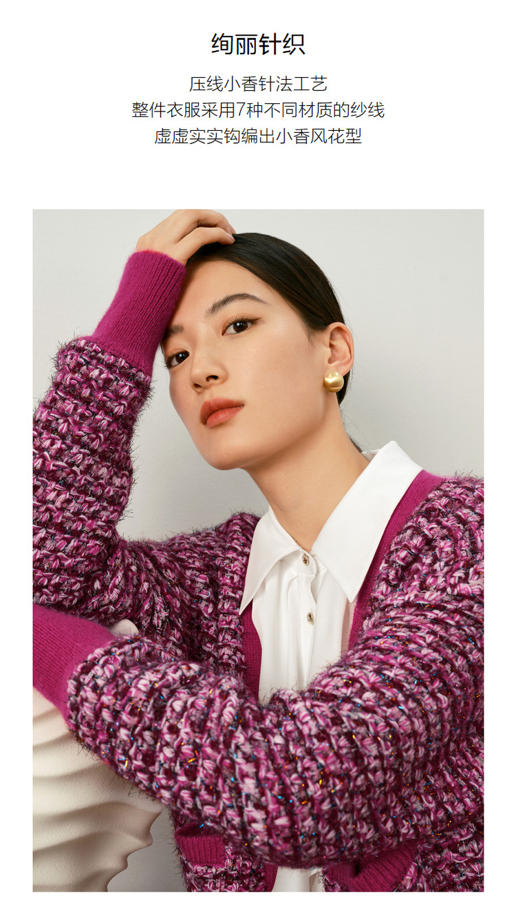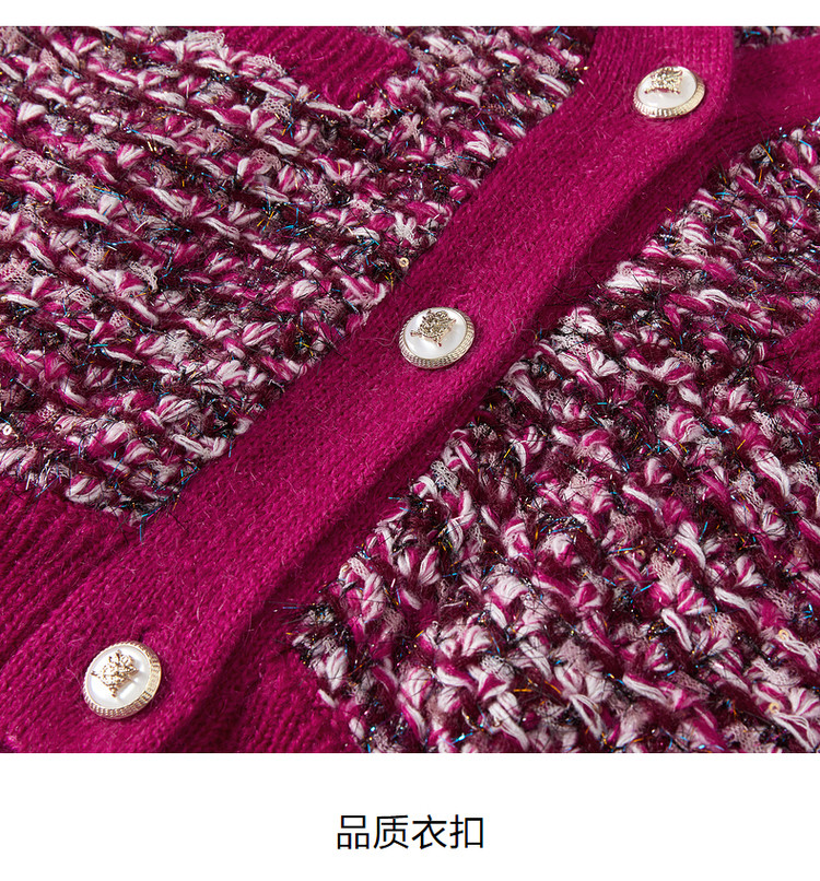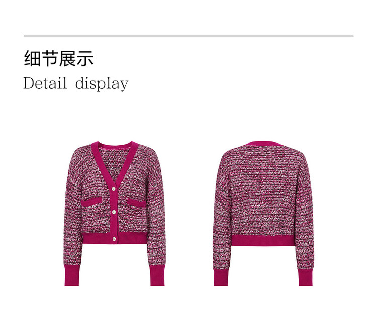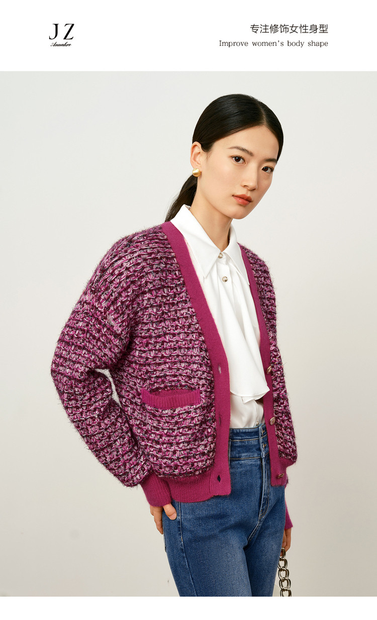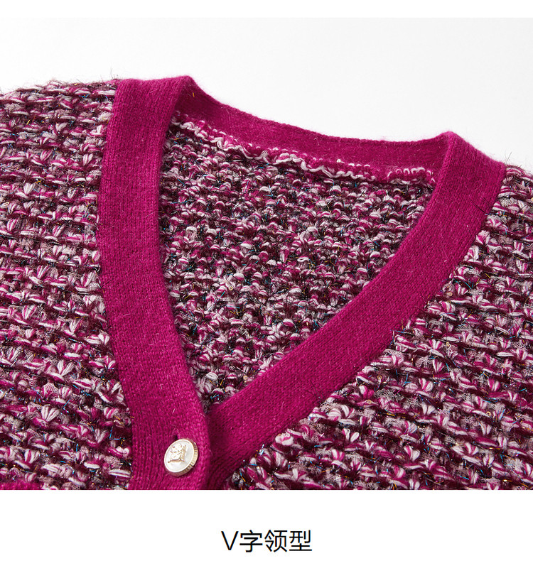商品名称:玖姿旗下安娜蔻系列V领复古休闲粗花呢落肩长袖针织开衫女秋 902156