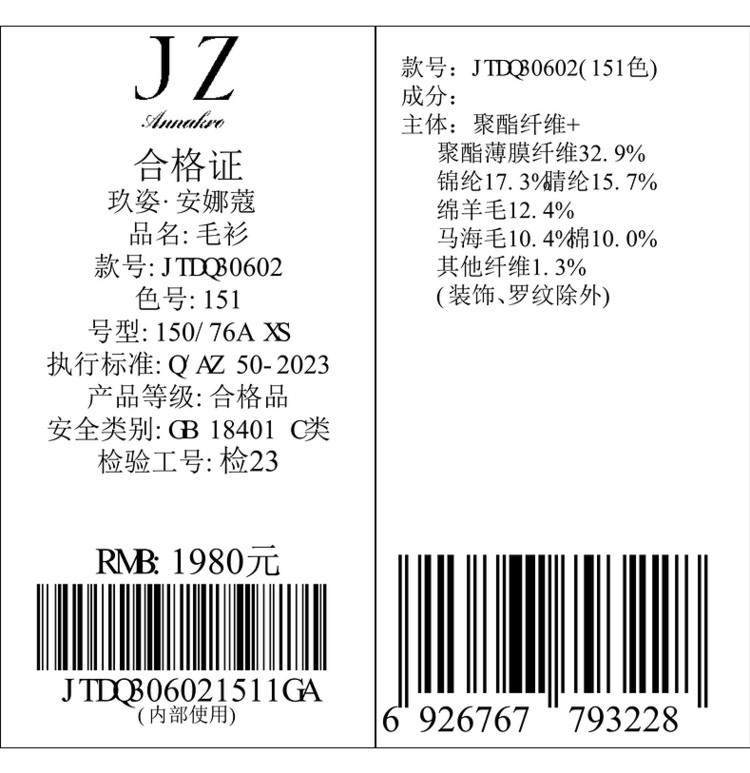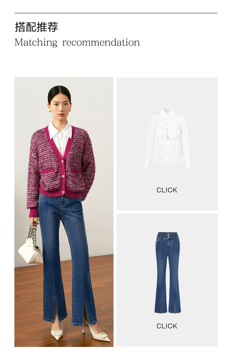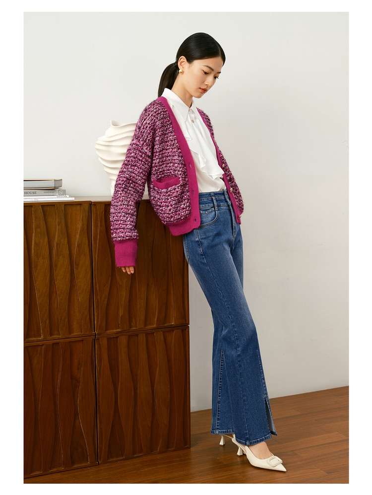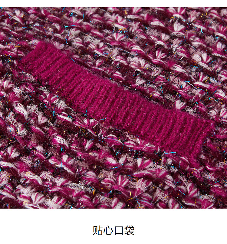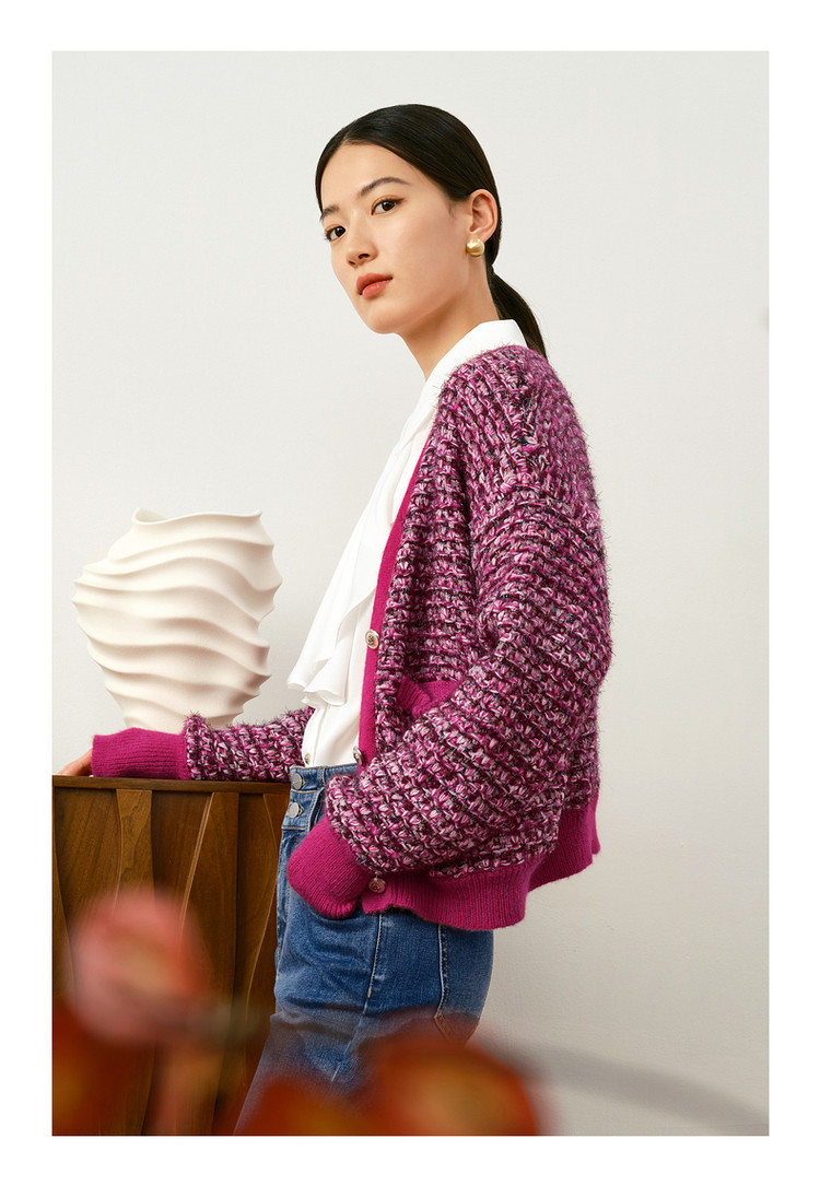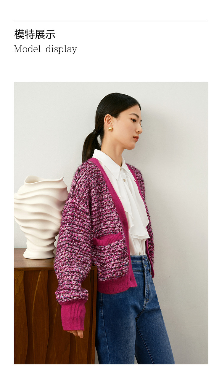 商品名称:玖姿旗下安娜蔻系列V领复古休闲粗花呢落肩长袖针织开衫女秋 902156