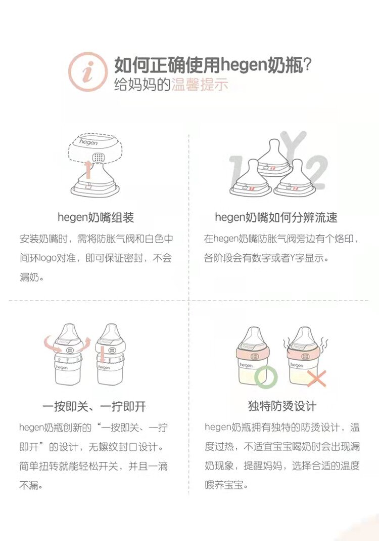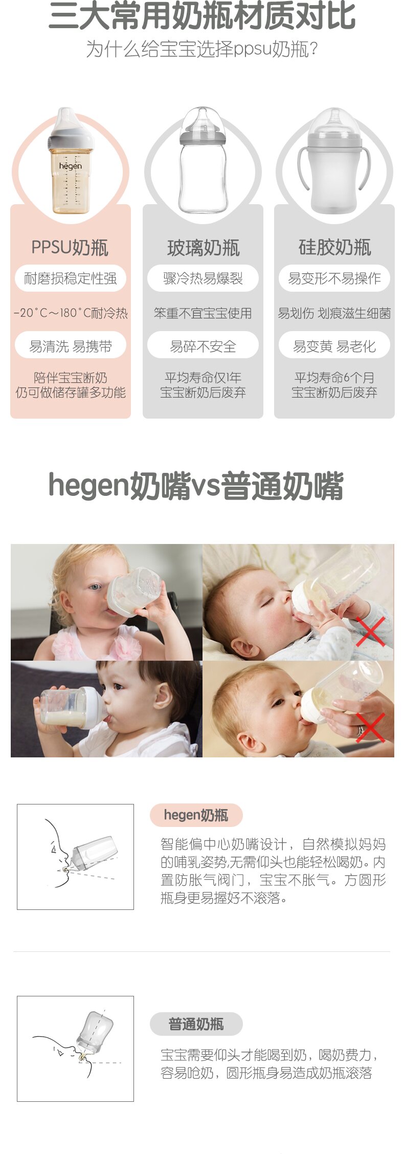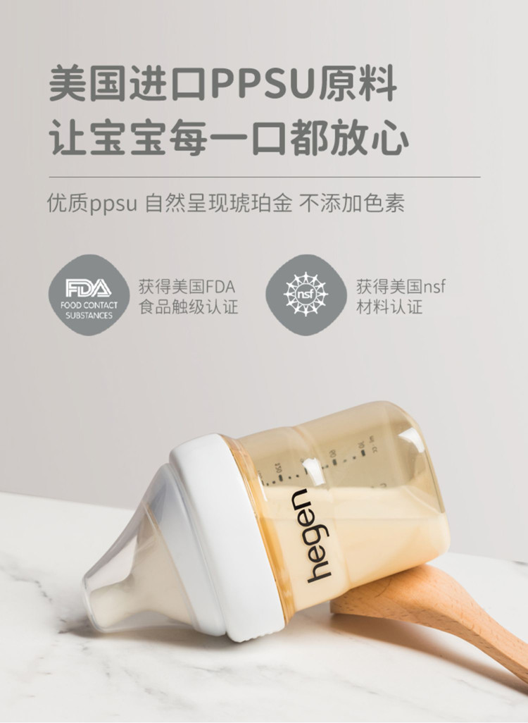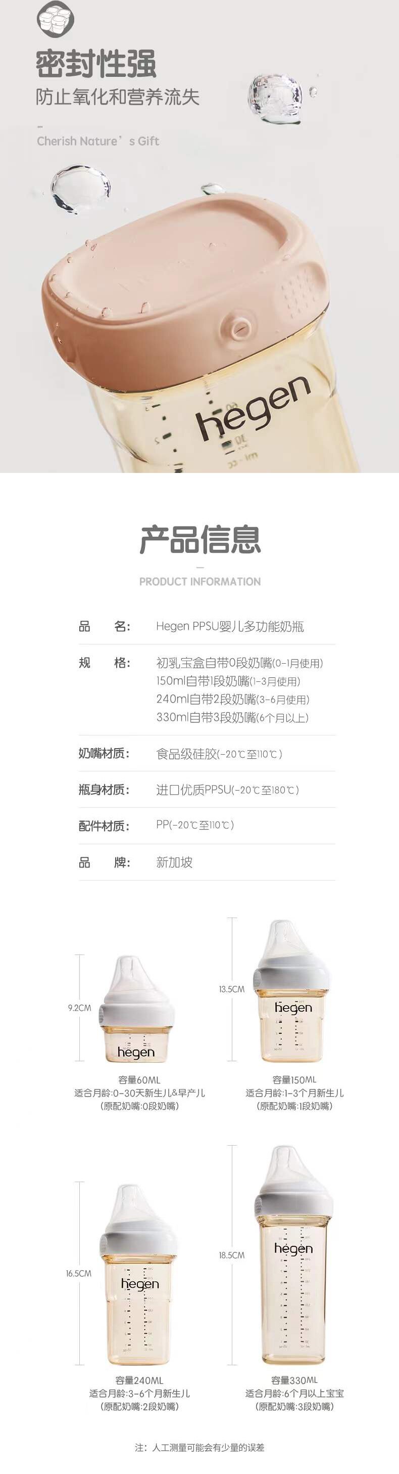 商品名称:hegen新加坡进口婴儿宽口径防胀气防呛多功能奶瓶 150ml(自带1段奶嘴,适合1-3个月宝宝)