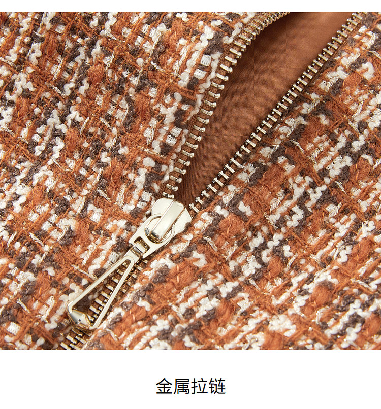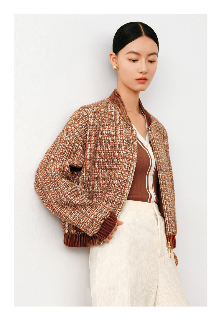 玖姿旗下安娜蔻系列长袖休闲拼接粗花呢棒球服外套女秋季 943116