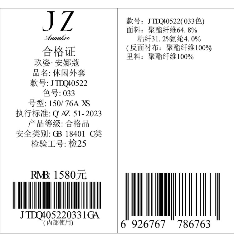 商品名称:玖姿旗下安娜蔻系列通勤截短式TR西装外套女秋季 982988
