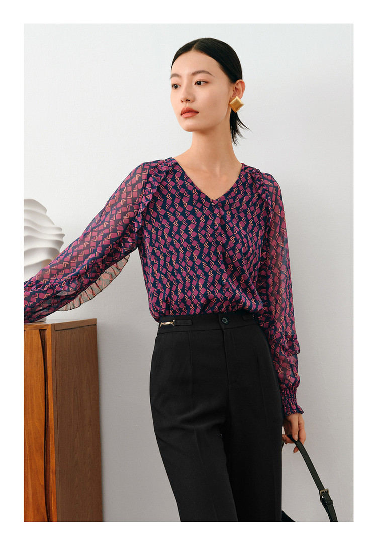 玖姿旗下安娜蔻系列V领波普轻熟风几何H型质感长袖雪纺衬衫女秋季 472460