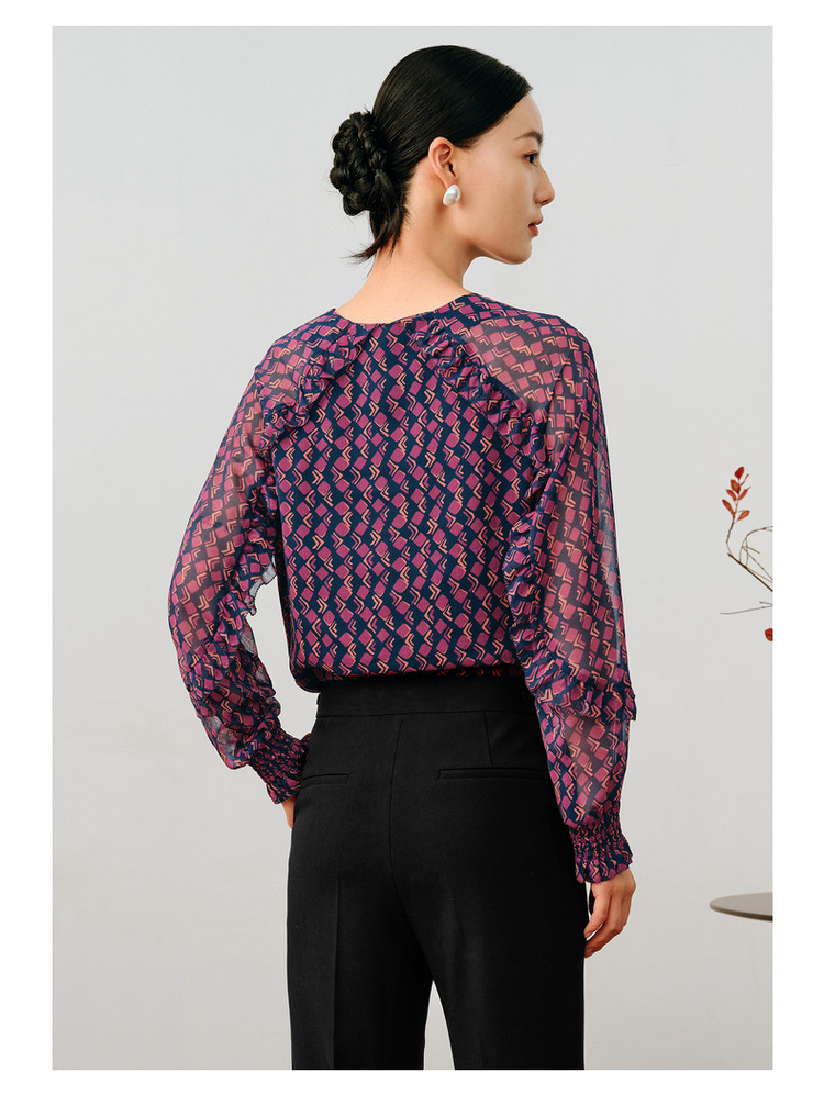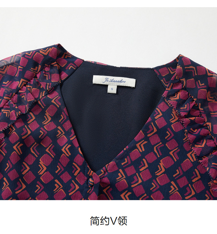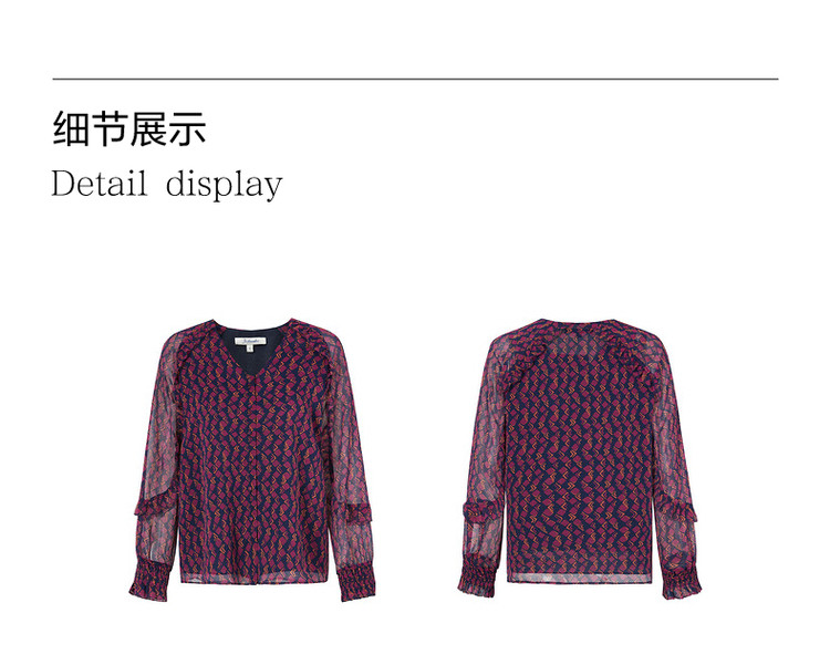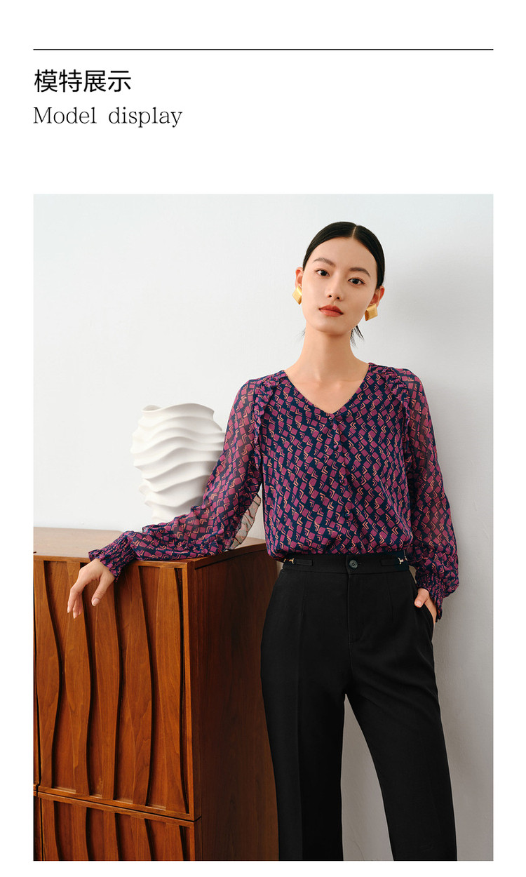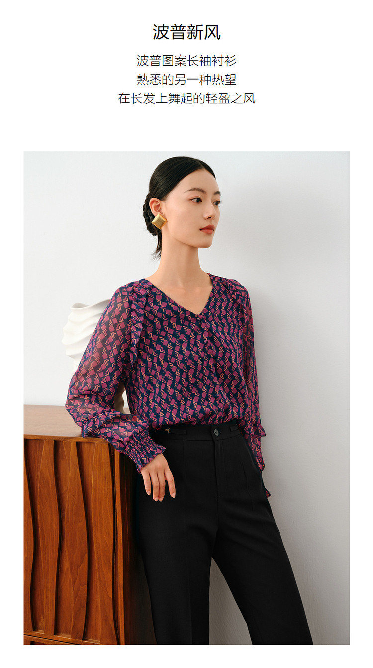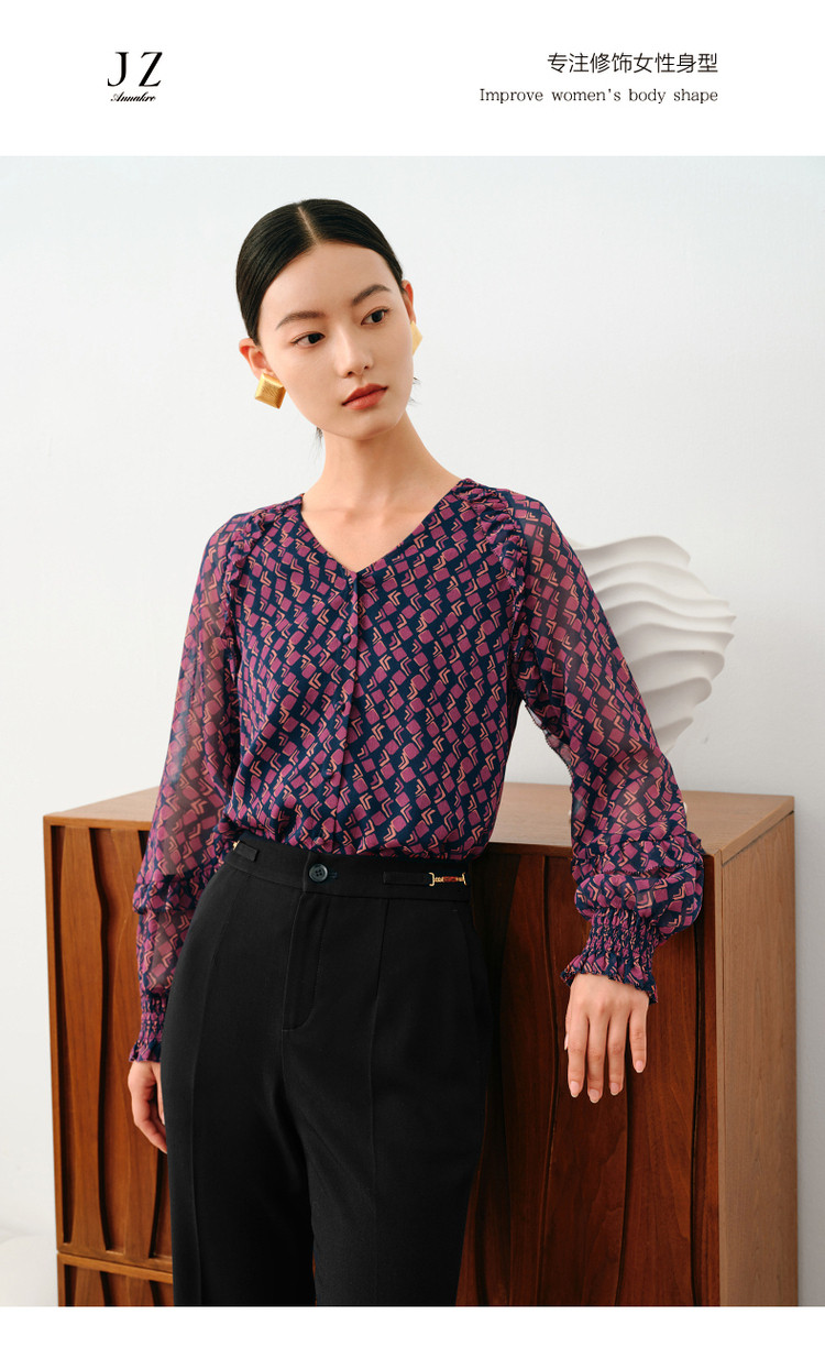 商品名称:玖姿旗下安娜蔻系列V领波普轻熟风几何H型质感长袖雪纺衬衫女秋季 472460