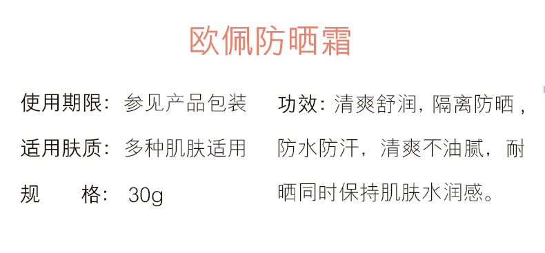 商品名称:欧佩 防晒霜 30g 面部防紫外线清爽遮瑕隔离霜防晒乳