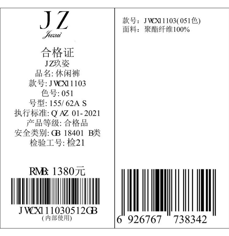 商品名称:JZ玖姿商场同款洋气通勤休闲裤子西裤春夏季JWCX11103 959948