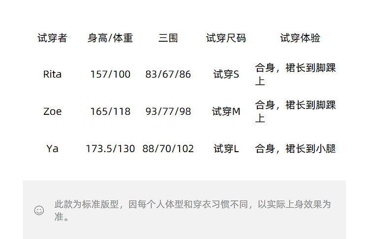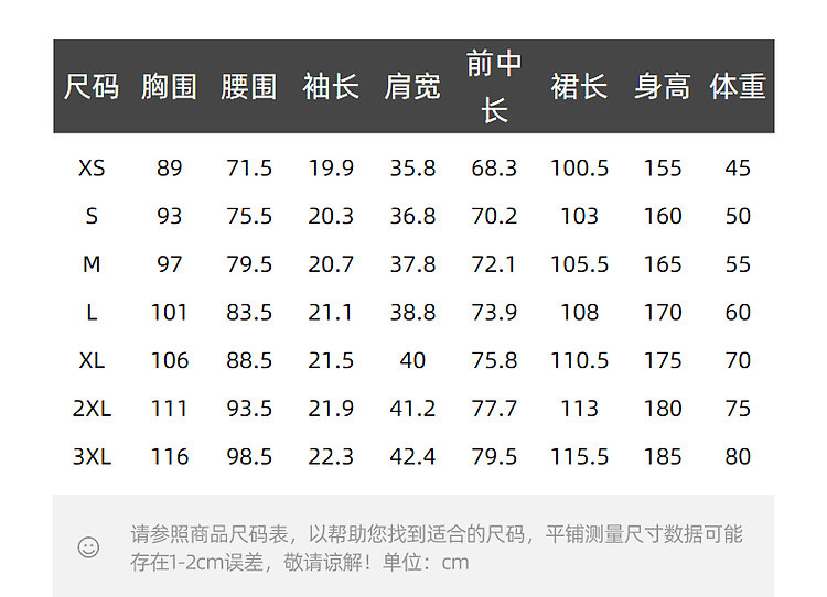 | 尺码 | 裙长(cm) | 肩宽(cm) | 腰围(cm) | 袖长(cm) | 胸围(cm) | 号型 |