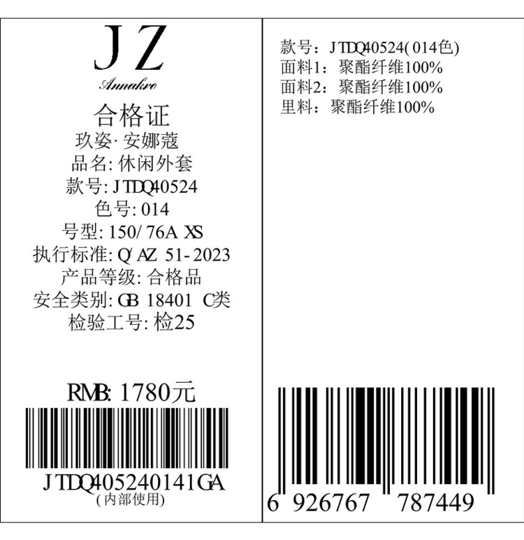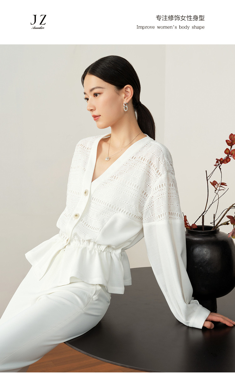 商品名称:玖姿旗下安娜蔻系列轻熟风休闲镂空收腰拼接外套女秋季 352012