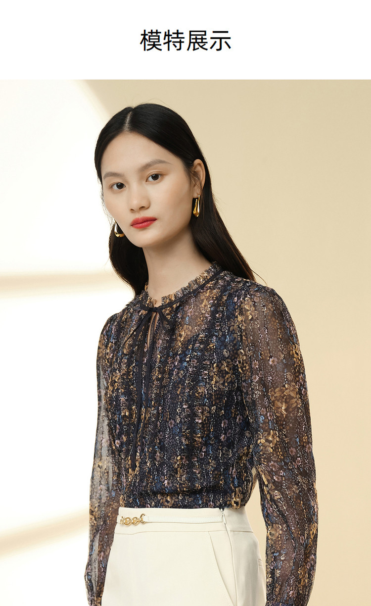 复古碎花网纱上衣女春季优雅系带时尚小衫商场同款 552524