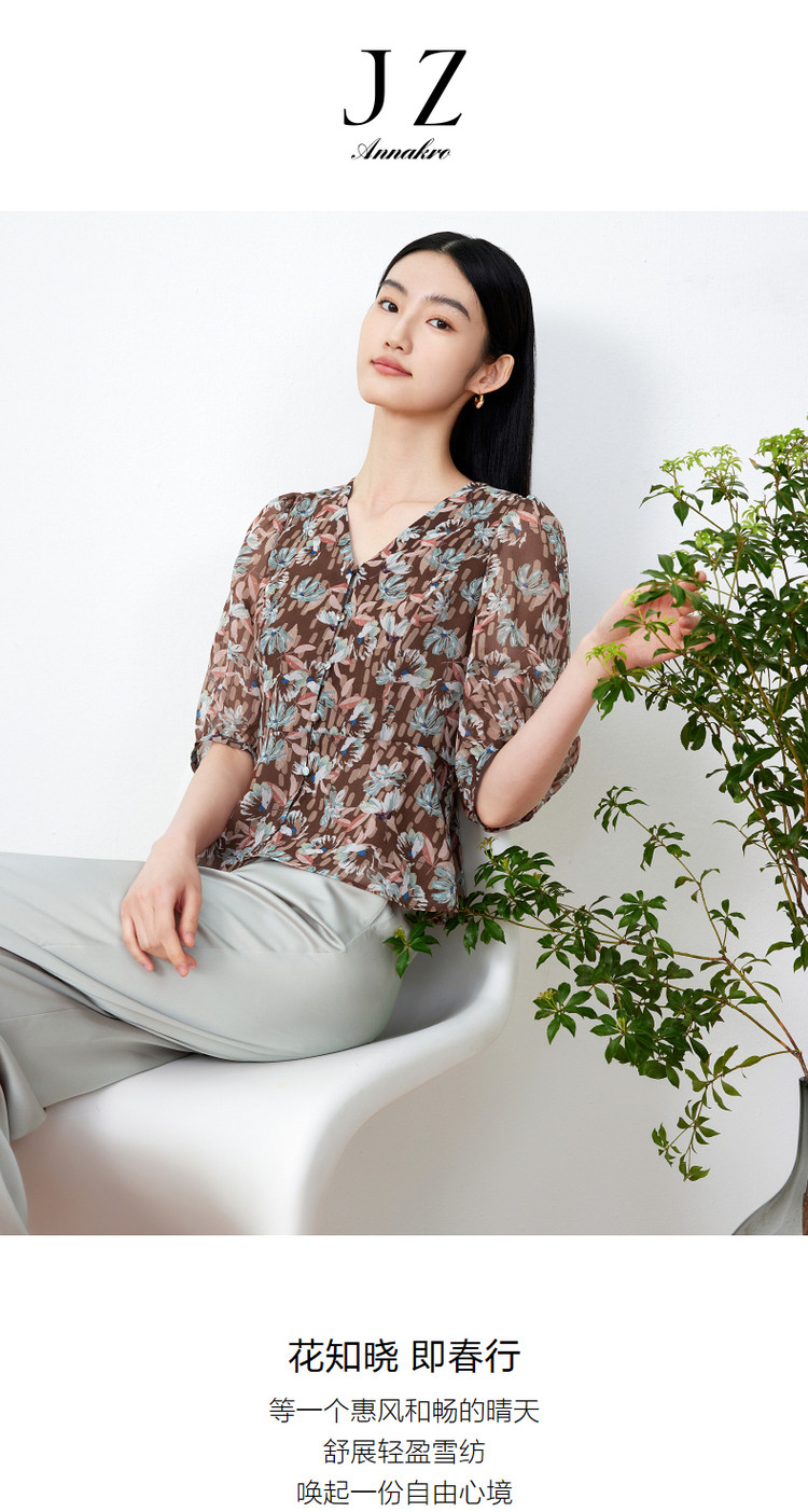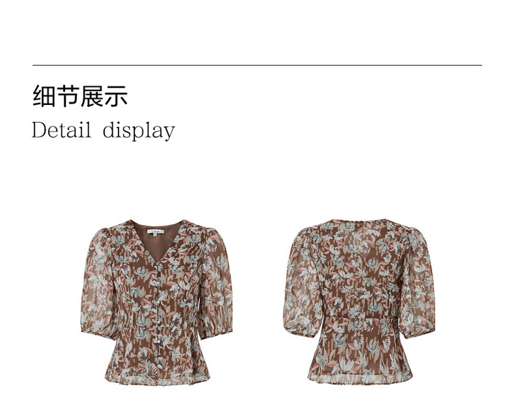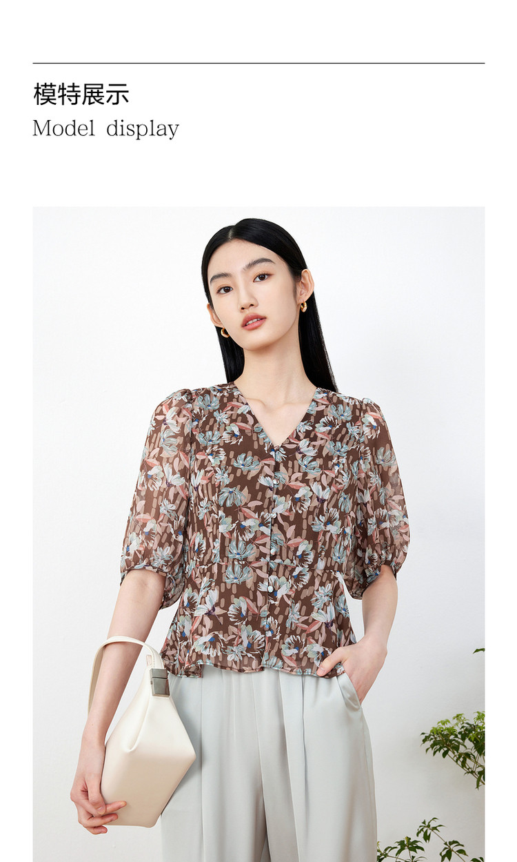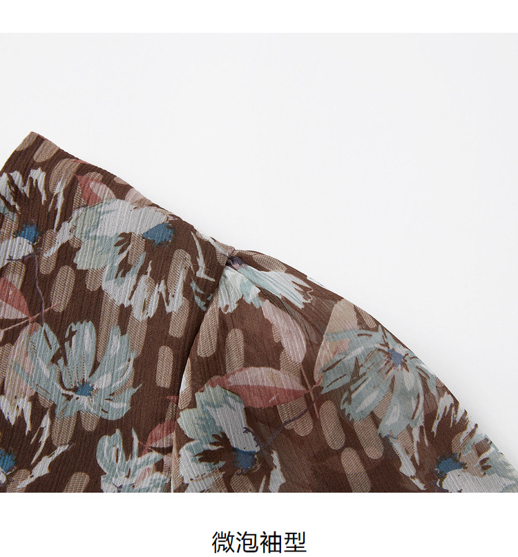 商品名称:玖姿旗下安娜蔻系列印花雪纺衬衫女装夏季V领泡泡袖轻盈感上衣 086028